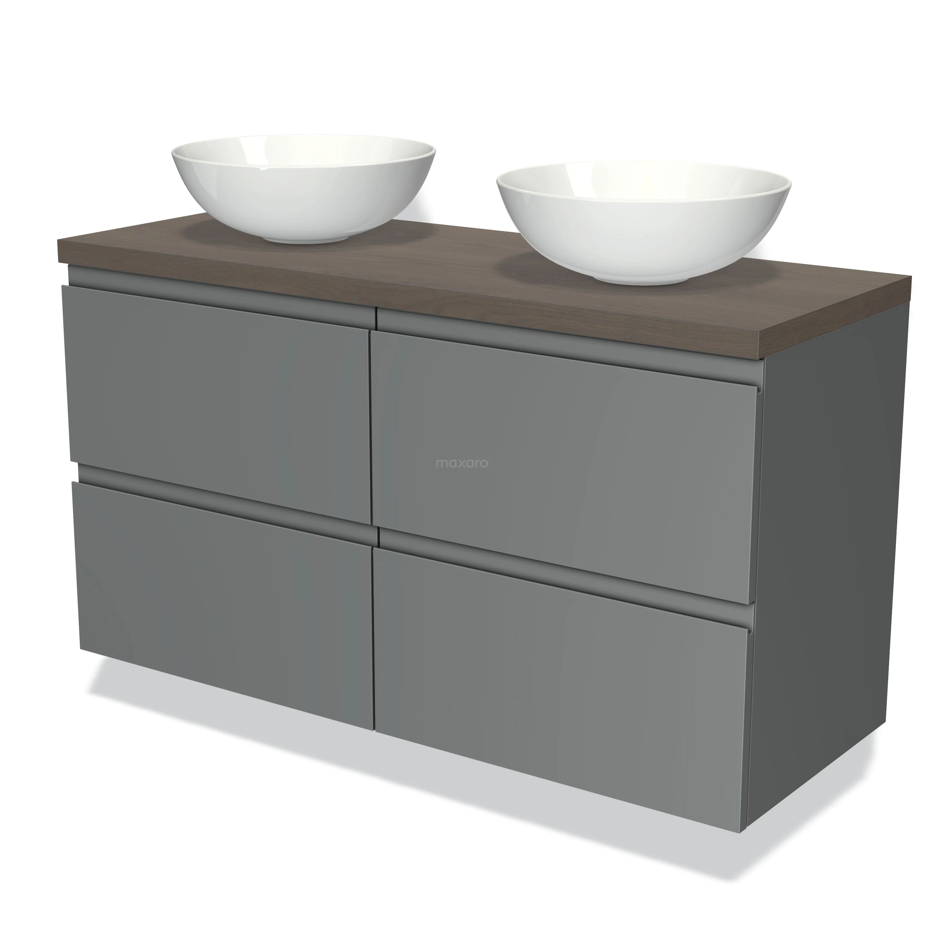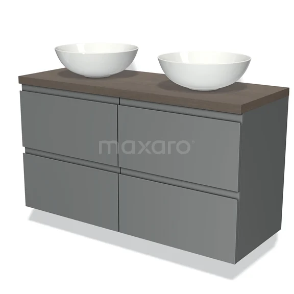 Badmöbel für Aufsatzwaschbecken 120cm Modulo Plato Mittelgrau 4 Schubladen Grifflos dunkelbraune Eiche Platte