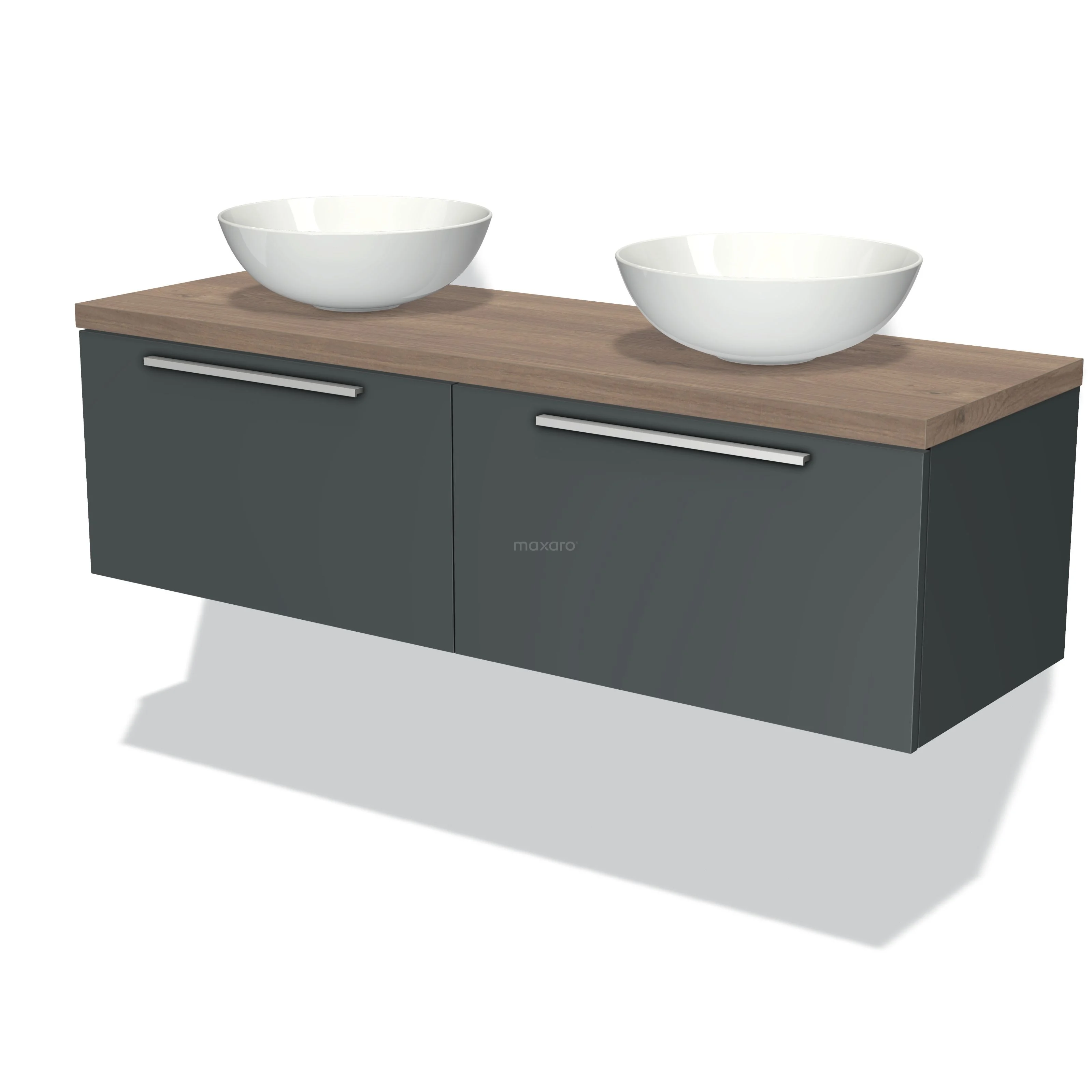 Badmöbel für Aufsatzwaschbecken 140cm Modulo Plato Dunkelgrau 2 Schubladen Flach Mittelbraune Eiche Platte