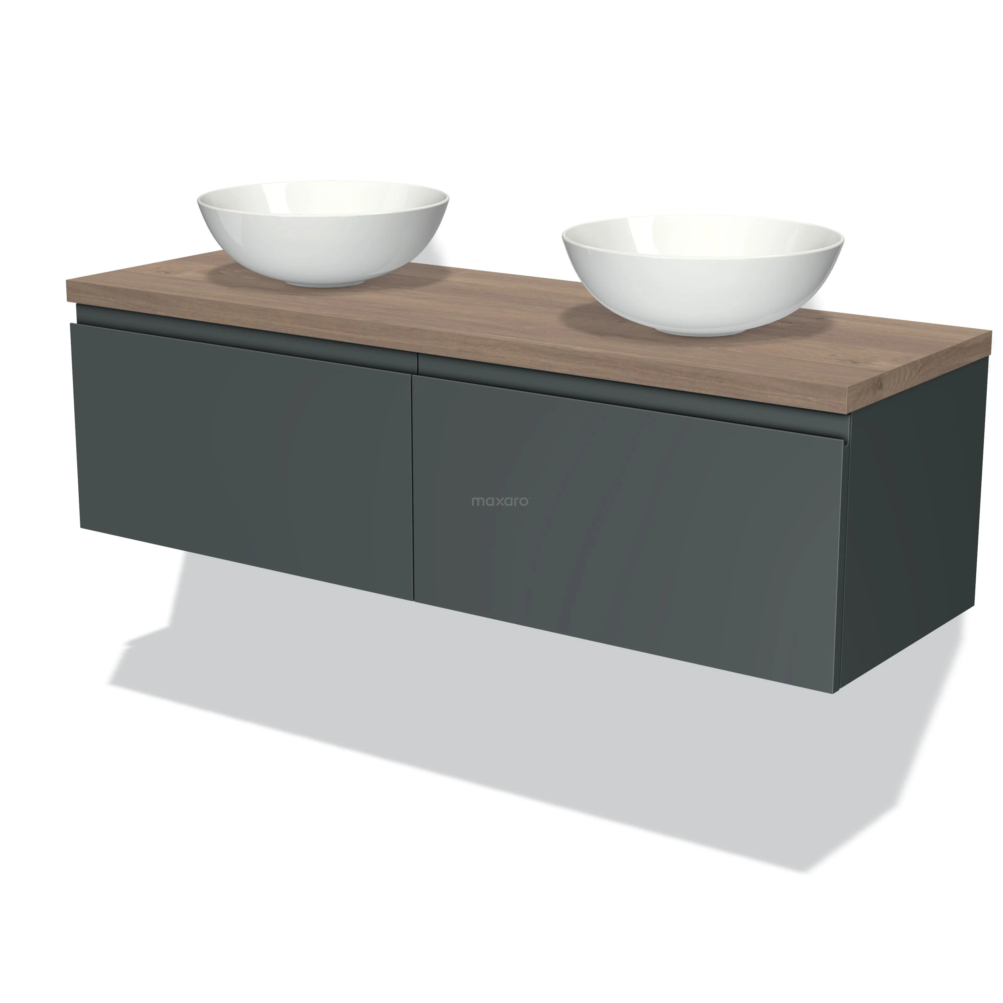 Badmöbel für Aufsatzwaschbecken 140cm Modulo Plato Dunkelgrau 2 Schubladen Grifflos Mittelbraune Eiche Platte
