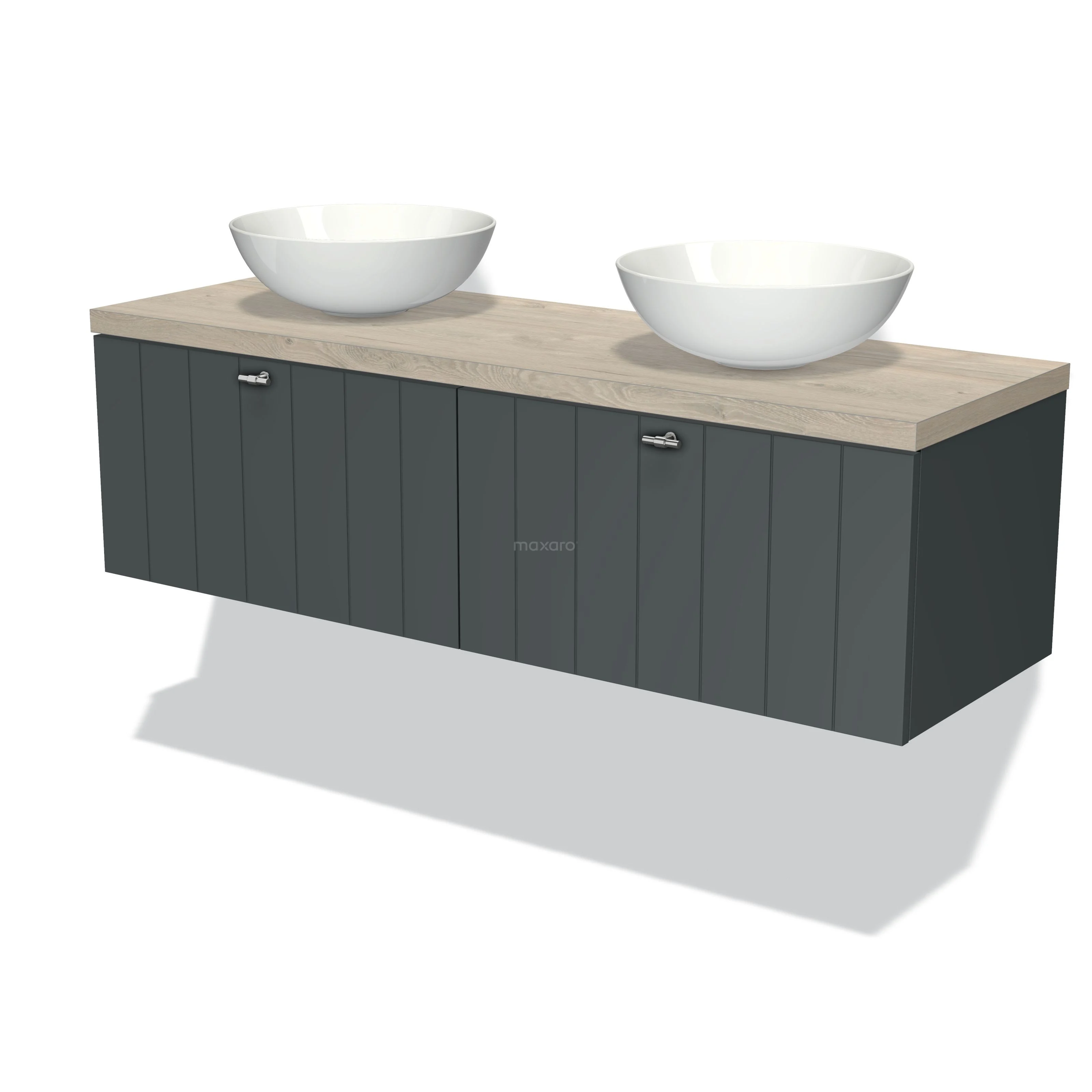 Badmöbel für Aufsatzwaschbecken 140cm Modulo Plato Dunkelgrau 2 Schubladen Lamelle Hellgraue Eiche Platte