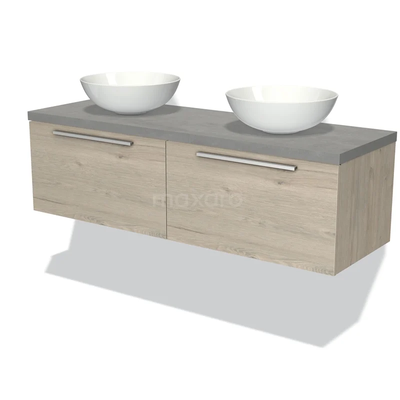 Badmöbel für Aufsatzwaschbecken 140cm Modulo Plato hellgraue Eiche 2 Schubladen Flach hellgrauer Beton Platte