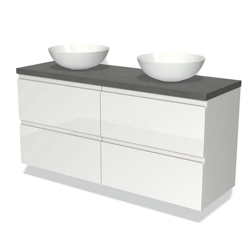 Badmöbel für Aufsatzwaschbecken 140cm Modulo Plato Hochglanz Weiß 4 Schubladen Grifflos Dunkelgrau Beton Platte