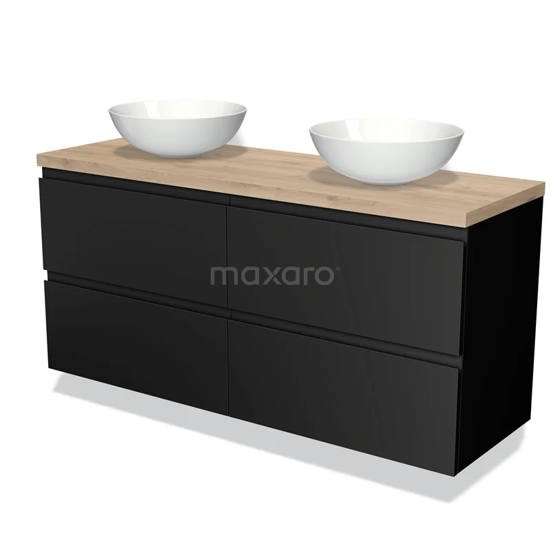 Badmöbel für Aufsatzwaschbecken 140cm Modulo Plato Matt Schwarz 4 Schubladen Grifflos Hellbraune Eiche Platte