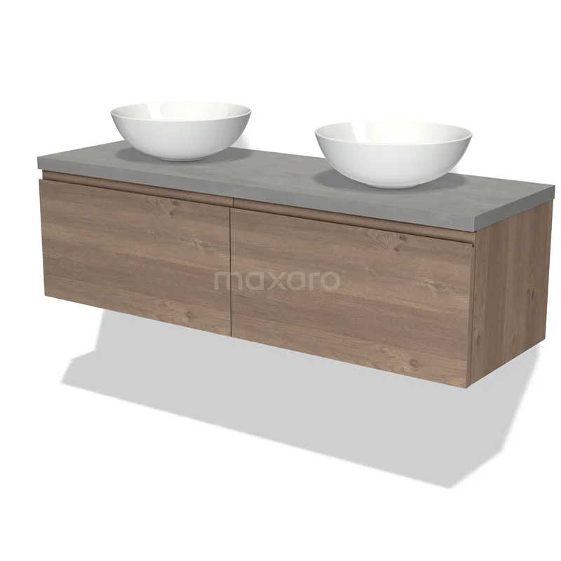 Modulo Plato Badmöbel mit Aufsatzwaschbecken | 140 cm Mittelbraune Eiche Grifflos front Hellgrauer Beton blatt 2 nebeneinanderliegende Schubladen