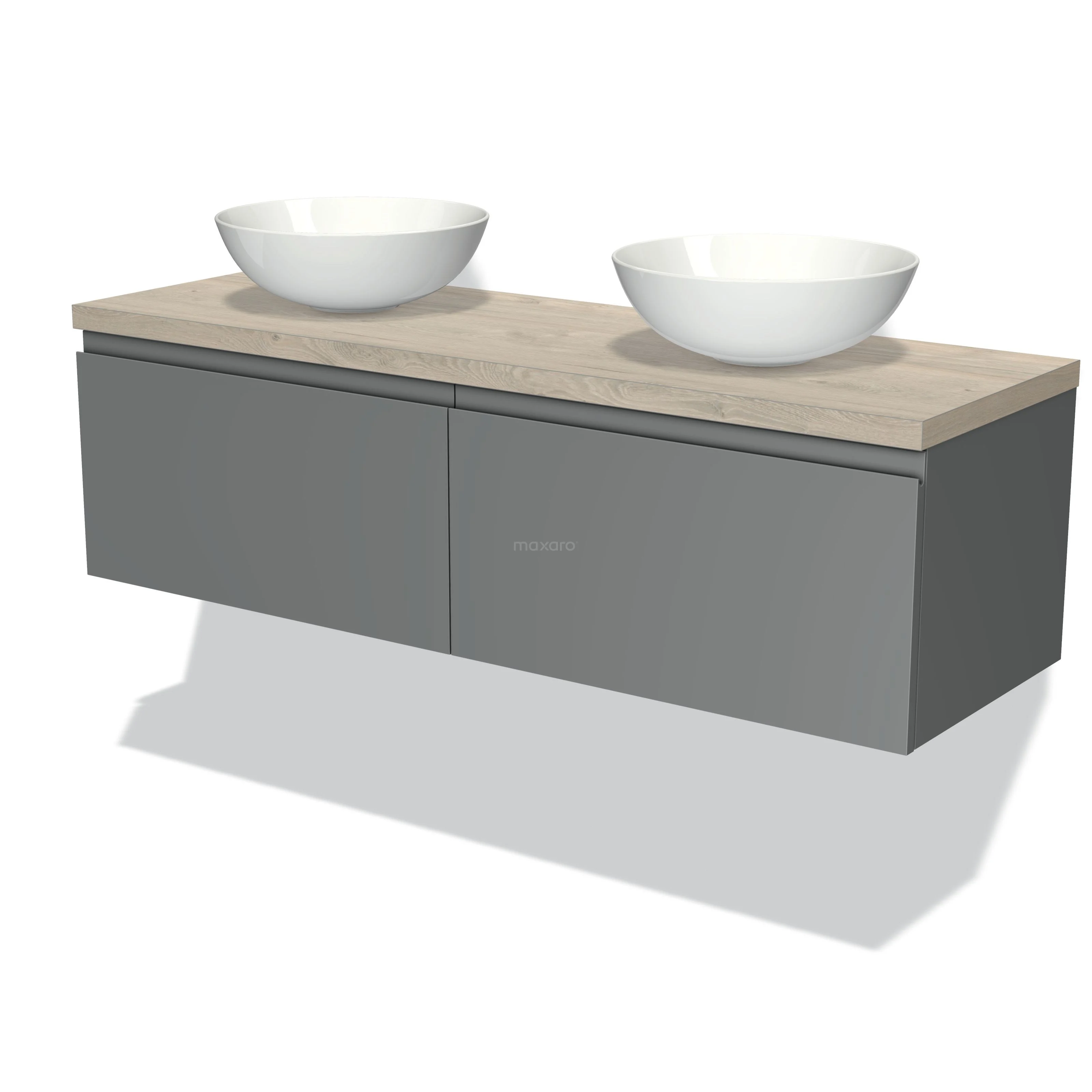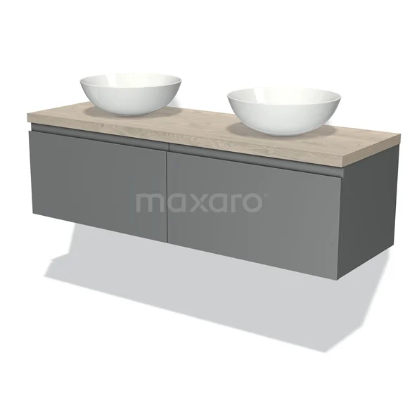 Badmöbel für Aufsatzwaschbecken 140cm Modulo Plato Mittelgrau 2 Schubladen Grifflos Hellgraue Eiche Platte