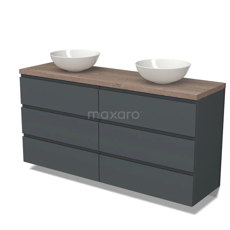 Badmöbel für Aufsatzwaschbecken 160cm Modulo Plato Dunkelgrau 3 Schubladen Grifflos mittelbraune Eiche Platte