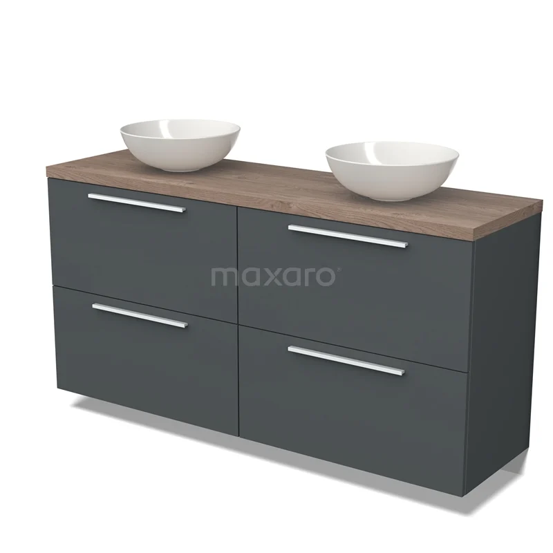 Badmöbel für Aufsatzwaschbecken 160cm Modulo Plato Dunkelgrau 4 hohe Schubladen Flach mittelbraune Eiche Platte