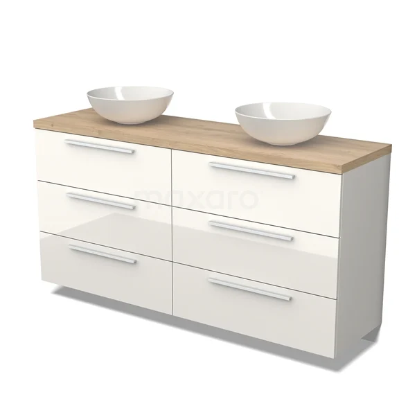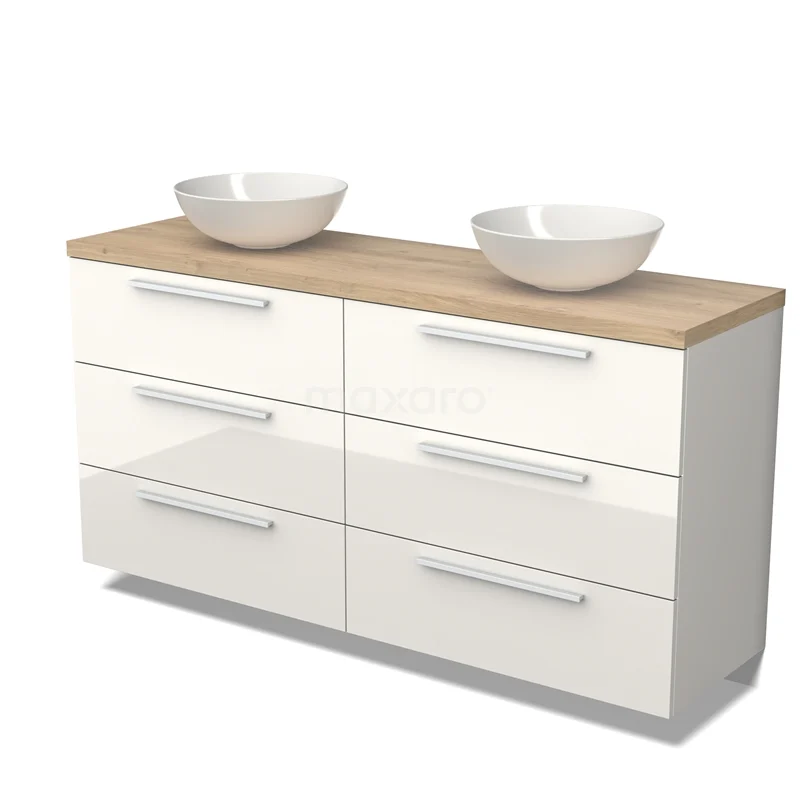 Modulo Plato Badmöbel mit Aufsatzwaschbecken | 160 cm Hochglanz Weiß Flach front Hellbraune Eiche blatt 6 Schubladen