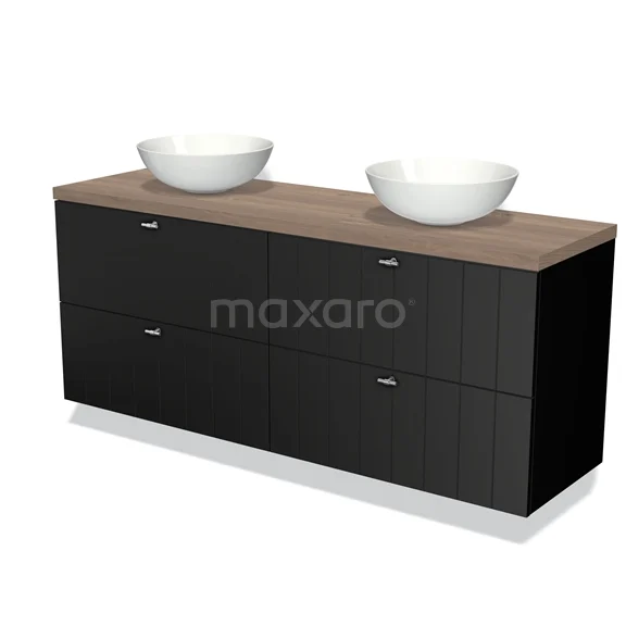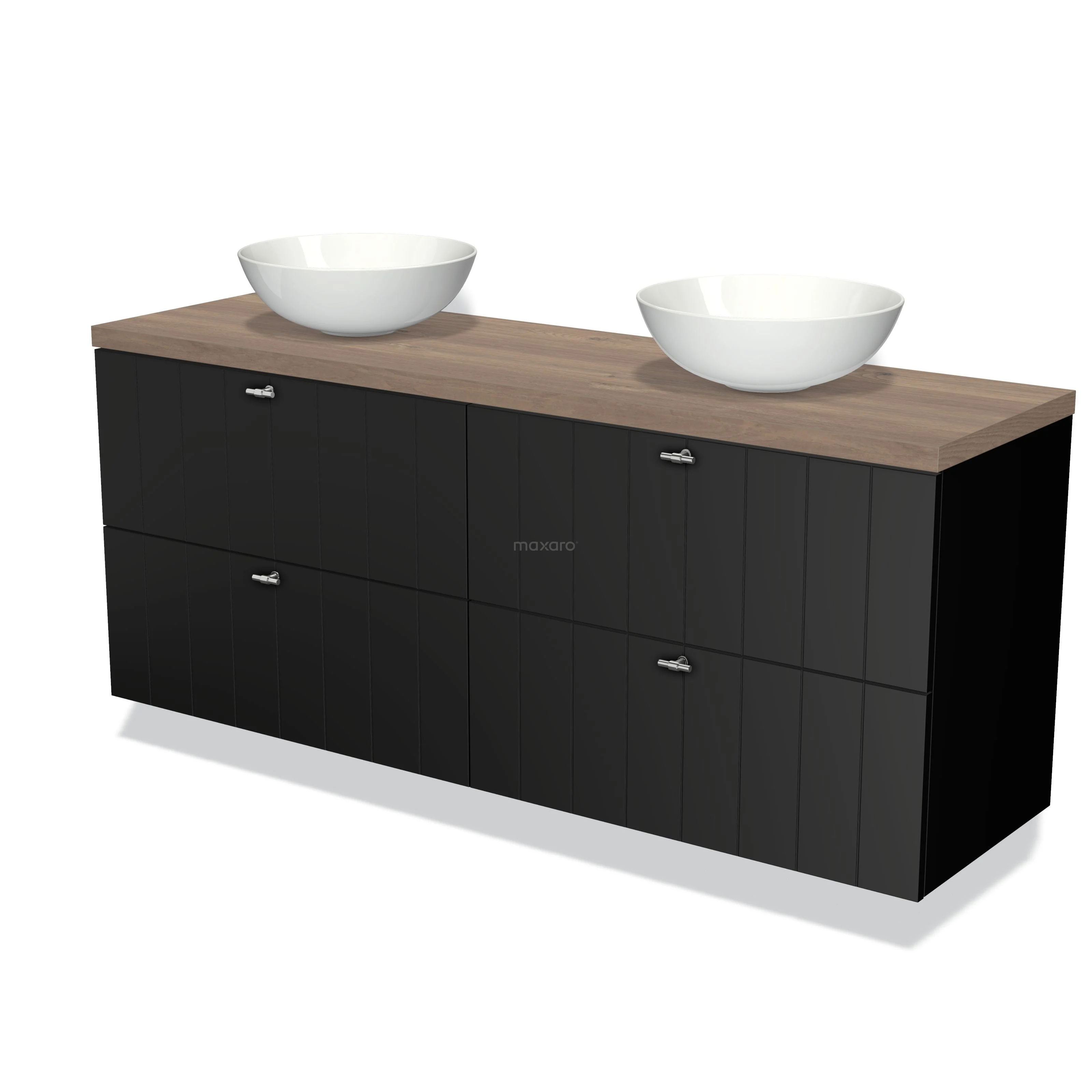 Modulo Plato Badmöbel mit Aufsatzwaschbecken | 160 cm Matt Schwarz Lamelle front Mittelbraune Eiche blatt 4 Schubladen