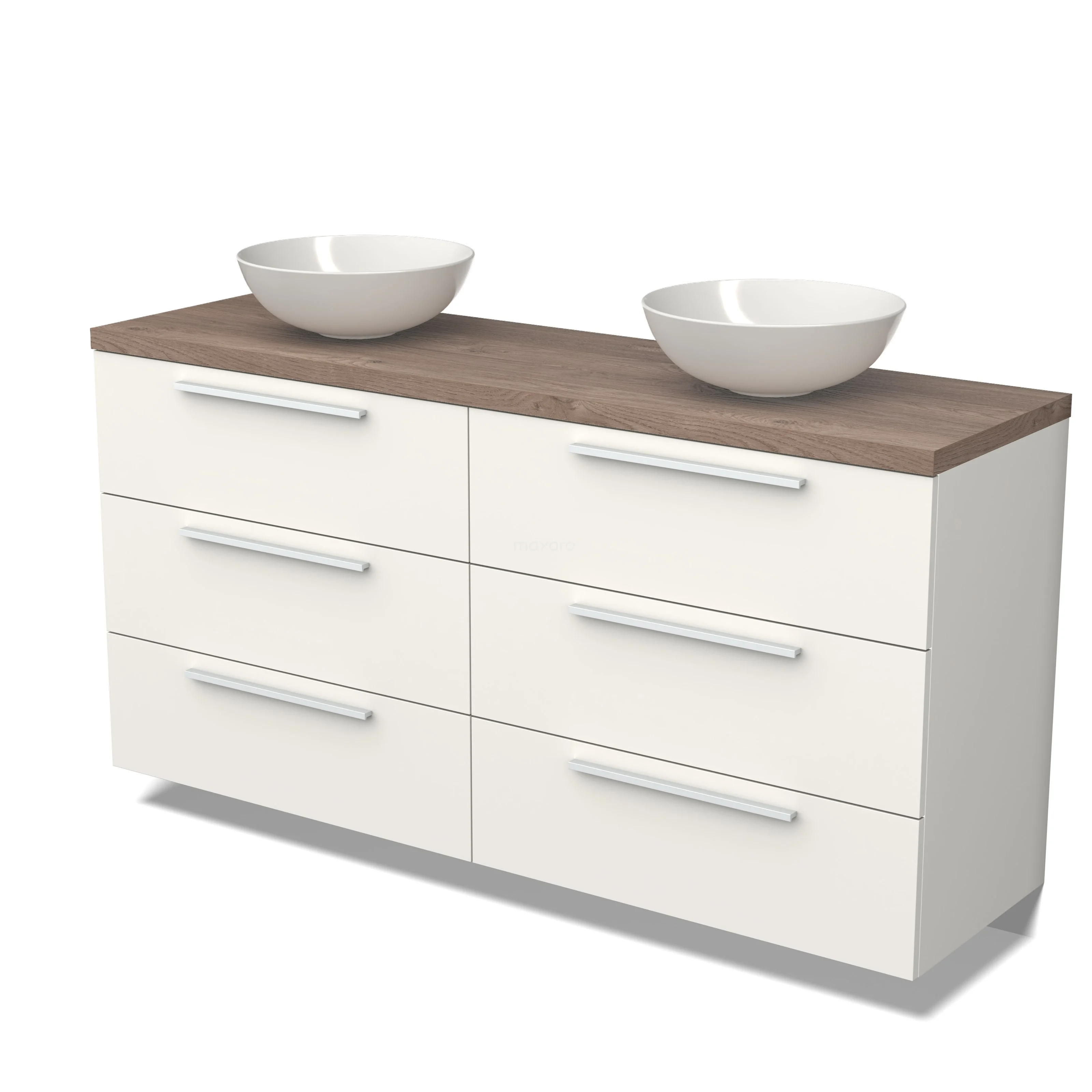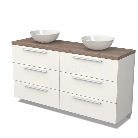 Modulo Plato Badmöbel mit Aufsatzwaschbecken | 160 cm Matt Weiß Flach front Mittelbraune Eiche blatt 6 Schubladen