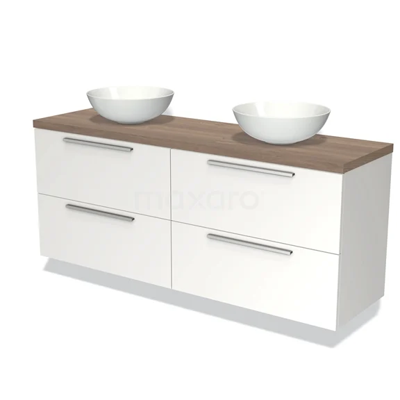 Badmöbel für Aufsatzwaschbecken 160cm Modulo Plato Matt Weiß 4 Schubladen Flach Mittelbraune Eiche Platte
