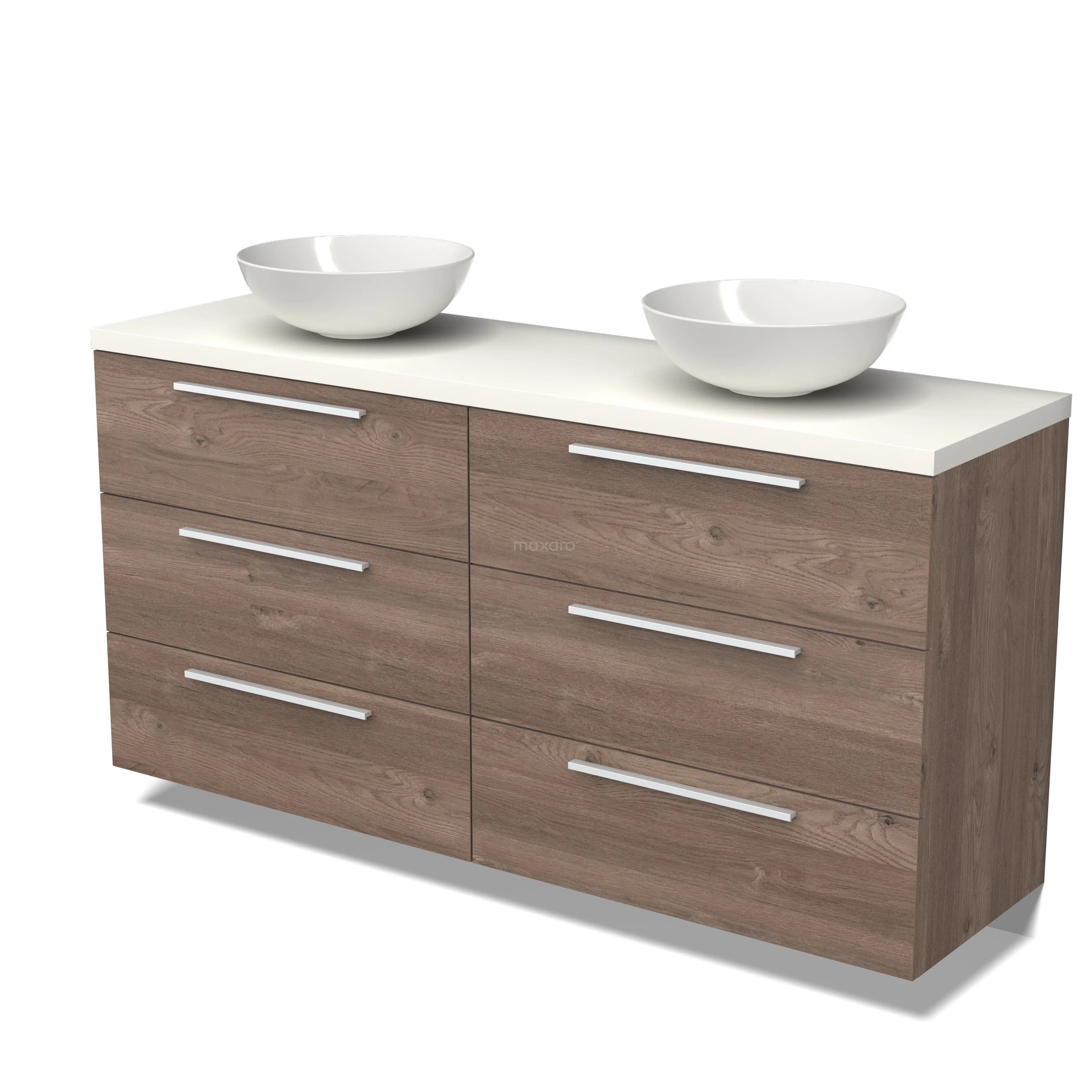 Modulo Plato Badmöbel mit Aufsatzwaschbecken | 160 cm Mittelbraune Eiche Flach front Matt Weiß blatt 6 Schubladen