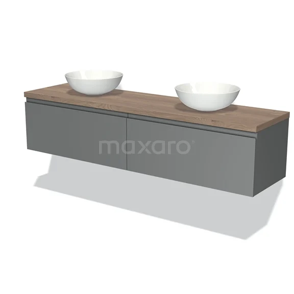 Badmöbel für Aufsatzwaschbecken 180cm Modulo Plato Mittelgrau 2 Schubladen Grifflos Mittelbraune Eiche Platte