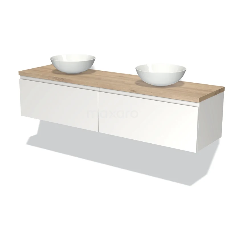 Badmöbel für Aufsatzwaschbecken 200cm Modulo Plato Matt Weiß 2 Schubladen Grifflos Hellbraune Eiche Platte