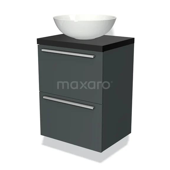 Modulo Plato Slim Badmöbel mit Aufsatzwaschbecken | 50 cm Dunkelgrau Flach front Matt Schwarz blatt 2 übereinanderliegende Schubladen