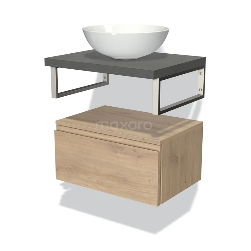 Badmöbel für Aufsatzwaschbecken 60 cm Modulo Plato Hellbraune Eiche 1 Schublade Grifflos Dunkelgrauer Beton Platte