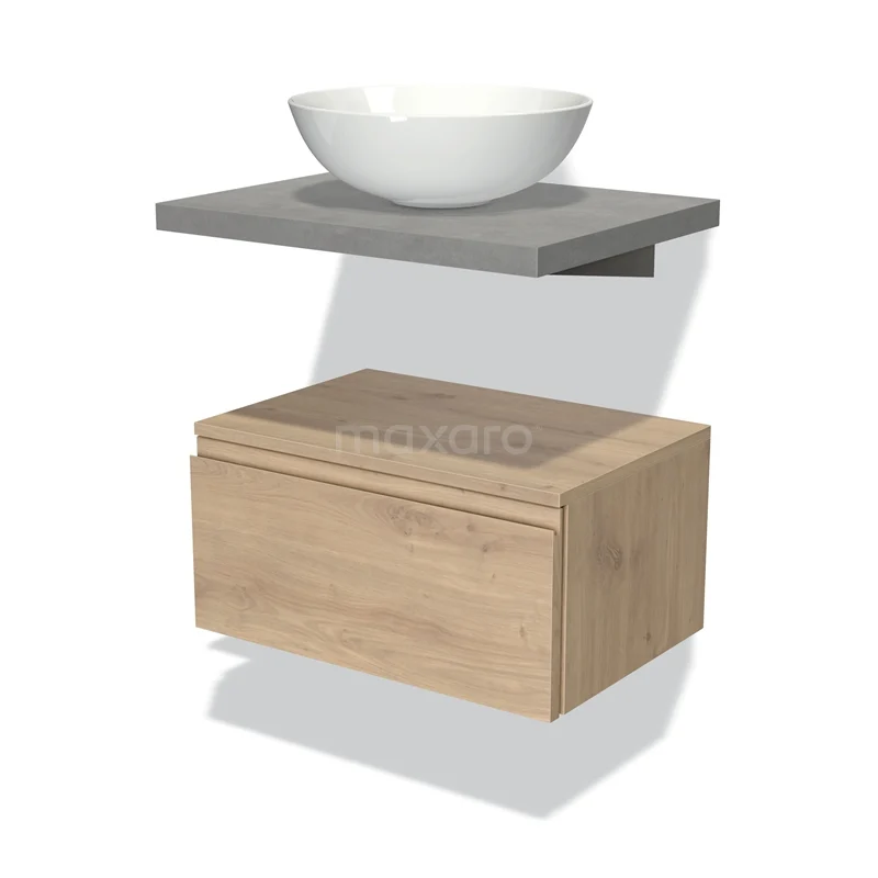 Badmöbel für Aufsatzwaschbecken 60 cm Modulo Plato Hellbraune Eiche 1 Schublade Grifflos Hellgrauer Beton Platte