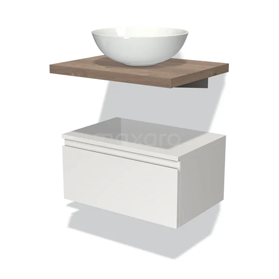 Badmöbel für Aufsatzwaschbecken 60 cm Modulo Plato Hochglanz Weiß 1 Schublade Grifflos Mittelbraune Eiche Platte