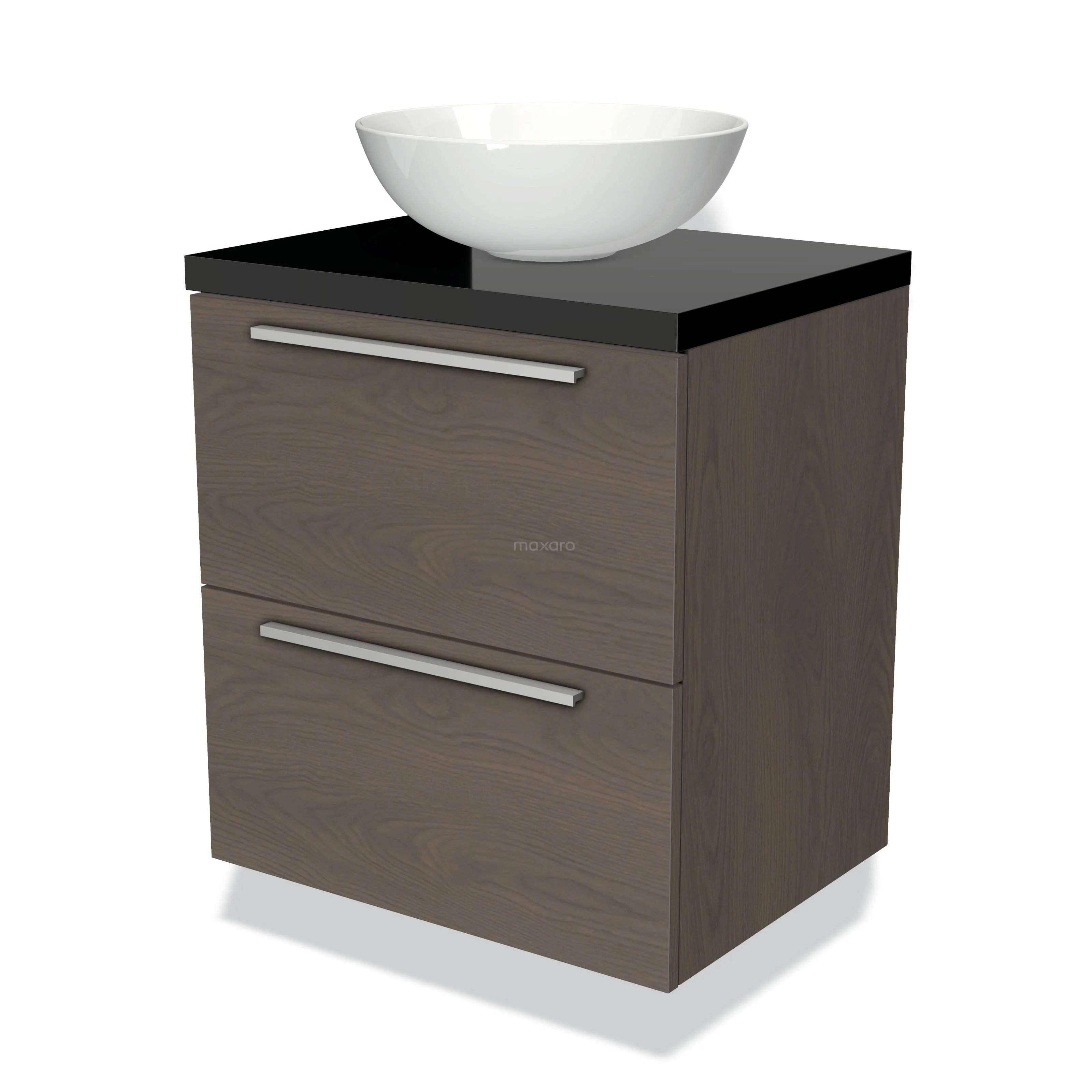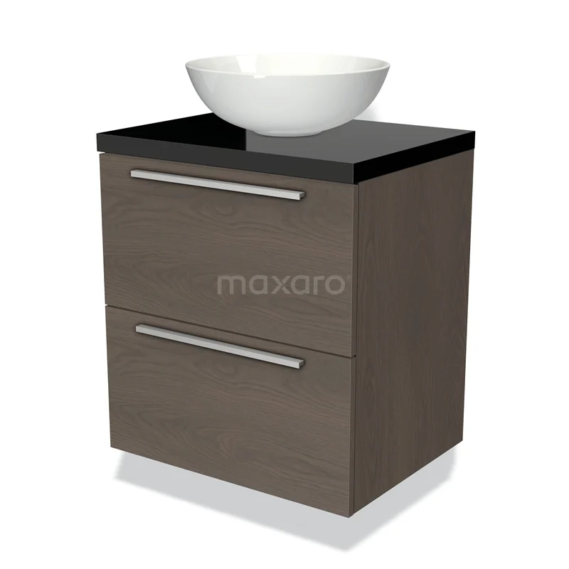 Badmöbel für Aufsatzwaschbecken 60cm Modulo Plato dunkelbraune Eiche 2 Schubladen Flach Hochglanz Schwarz Platte