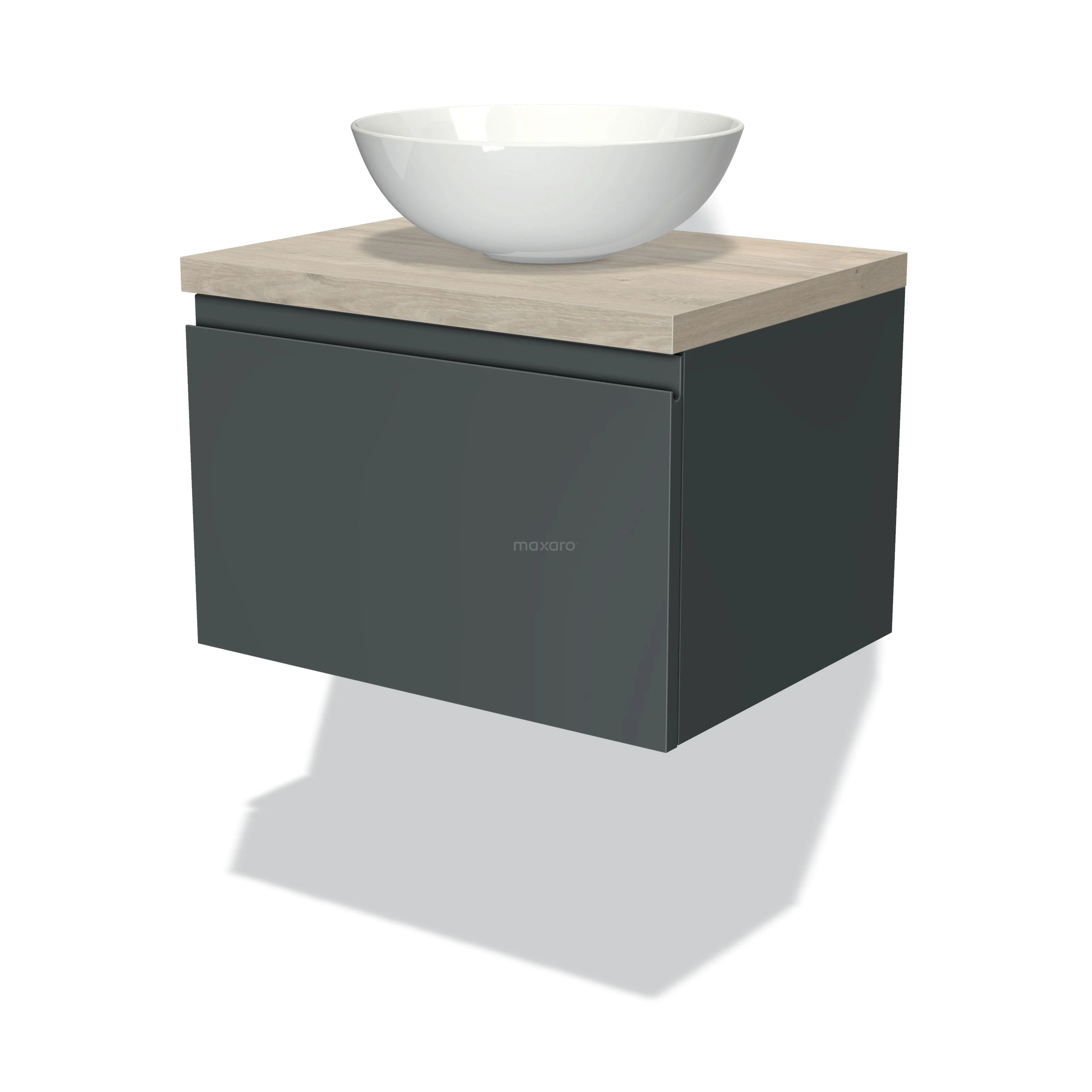 Badmöbel für Aufsatzwaschbecken 60cm Modulo Plato Dunkelgrau 1 Schublade Grifflos Hellgraue Eiche Platte
