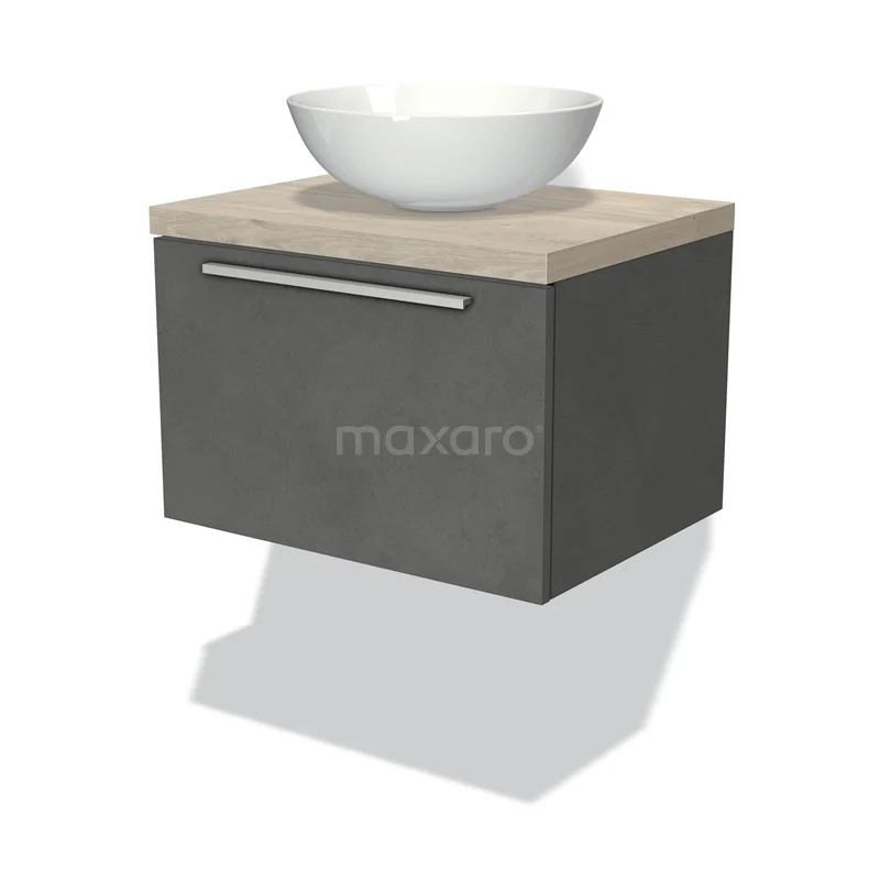 Badmöbel für Aufsatzwaschbecken 60cm Modulo Plato Dunkelgrauer Beton 1 Schubladen Flach Hellgraue Eiche Platte