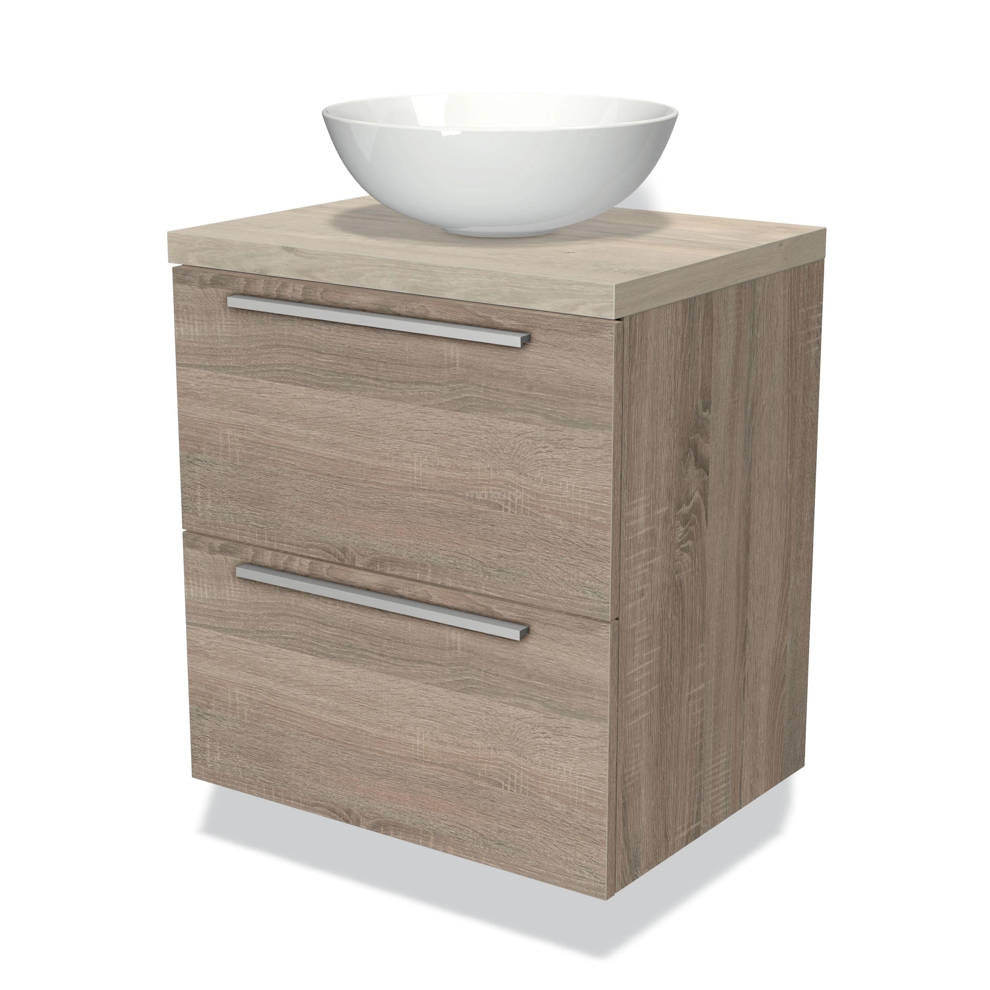 Badmöbel für Aufsatzwaschbecken 60cm Modulo Plato Eiche 2 Schubladen Flach hellgraue Eiche Platte