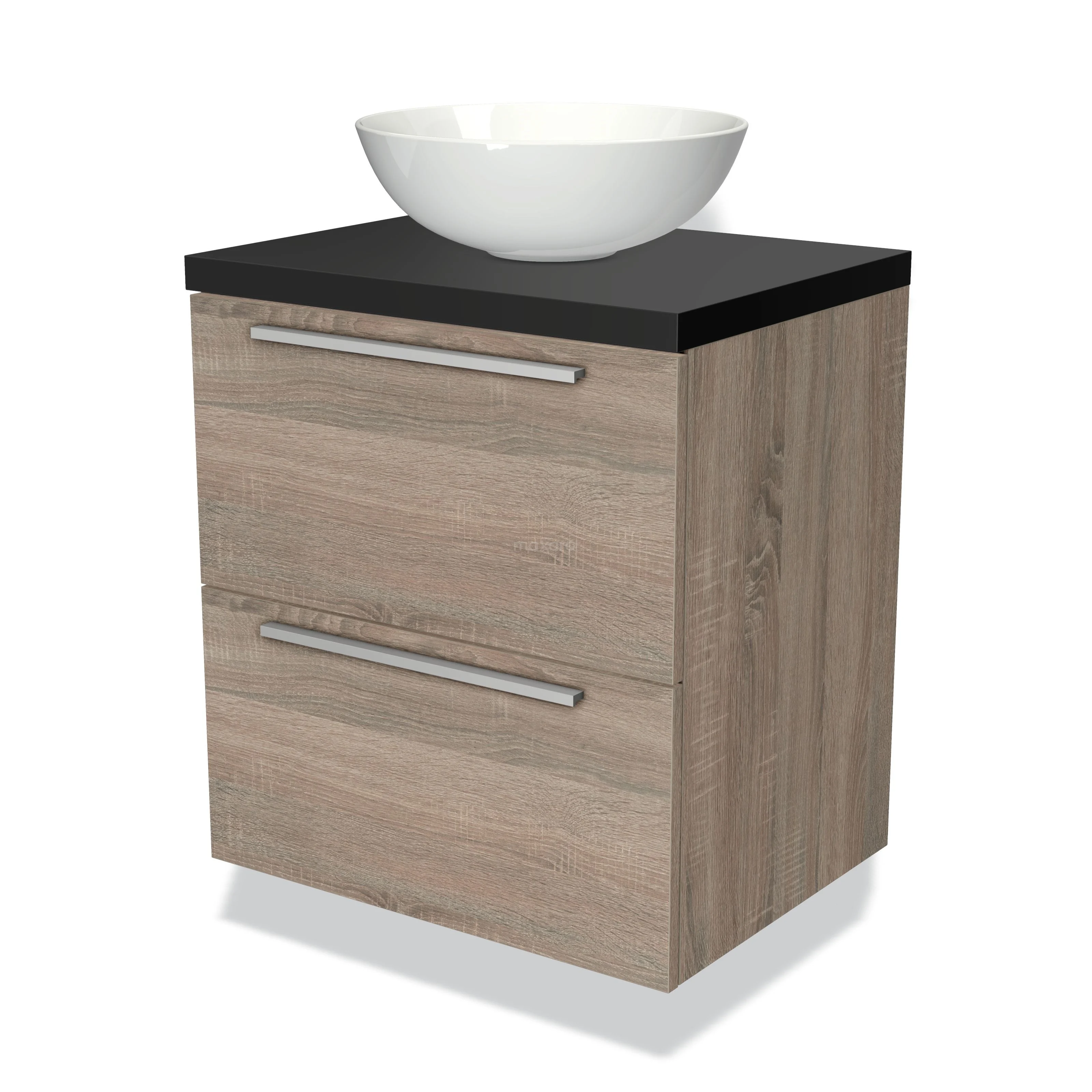 Badmöbel für Aufsatzwaschbecken 60cm Modulo Plato Eiche 2 Schubladen Flach Matt Schwarz Platte