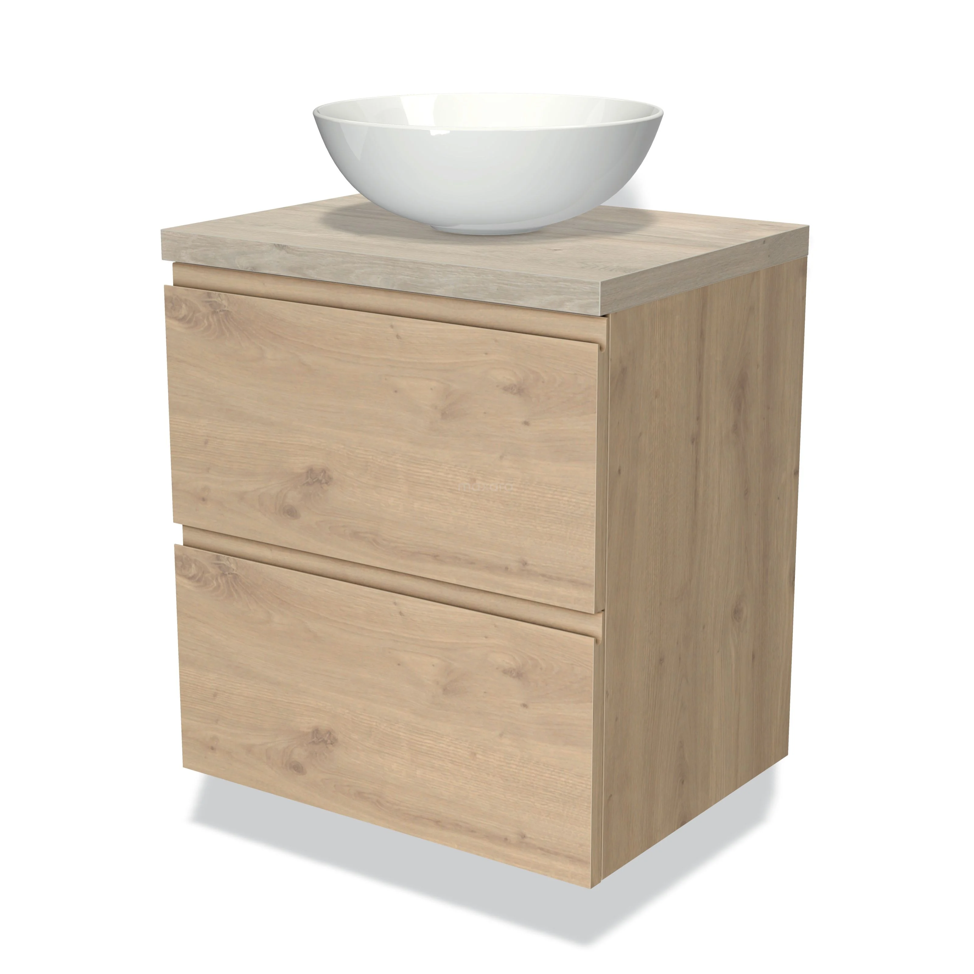 Badmöbel für Aufsatzwaschbecken 60cm Modulo Plato Hellbraune Eiche 2 Schubladen Grifflos Hellgraue Eiche Platte