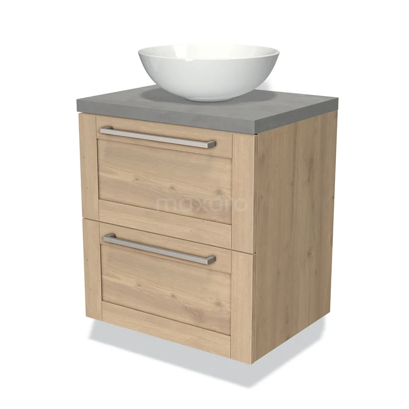 Badmöbel für Aufsatzwaschbecken 60cm Modulo Plato Hellbraune Eiche 2 Schubladen Rahmen hellgrauer Beton Platte