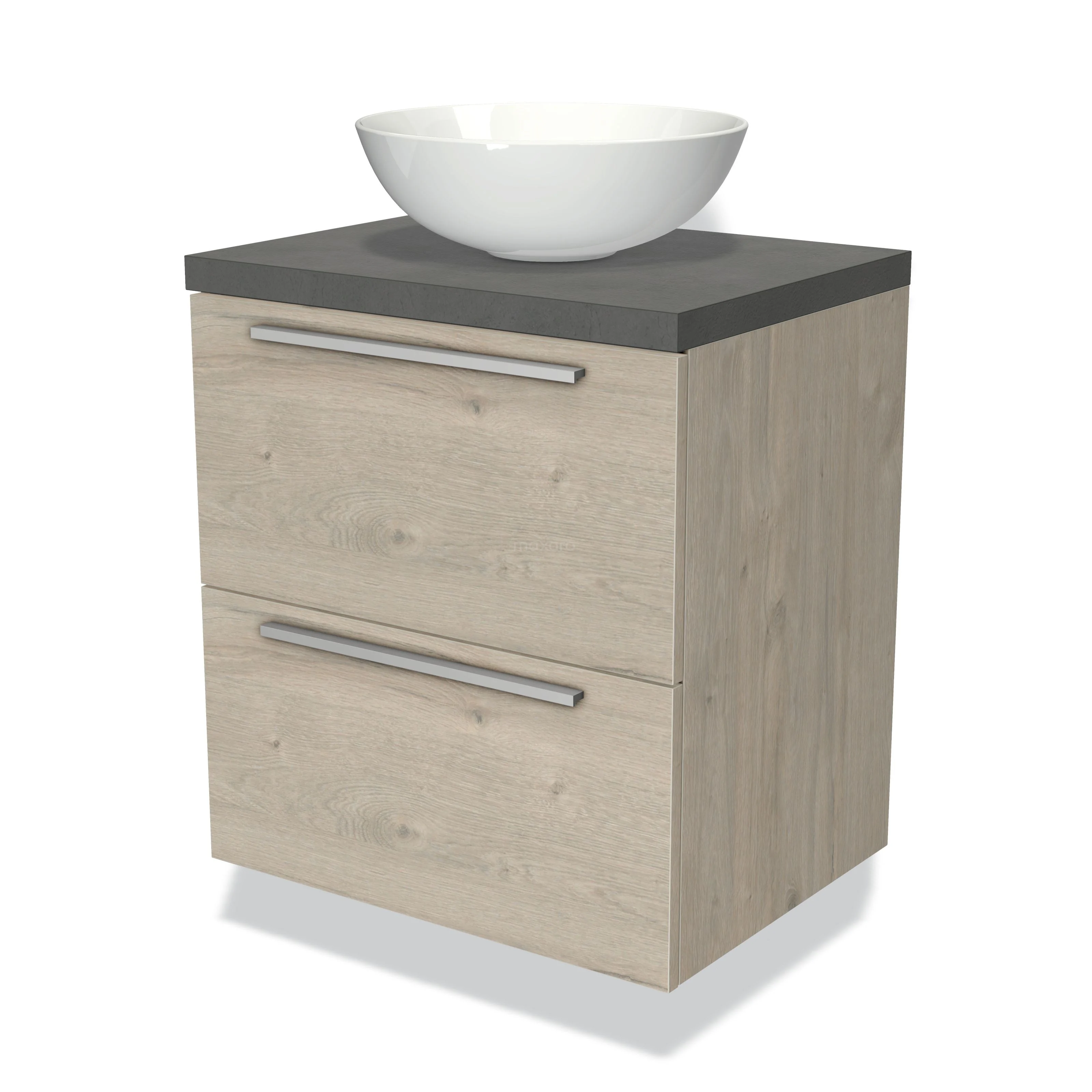 Badmöbel für Aufsatzwaschbecken 60cm Modulo Plato Hellgraue Eiche 2 Schubladen Flach Dunkelgrauer Beton Platte