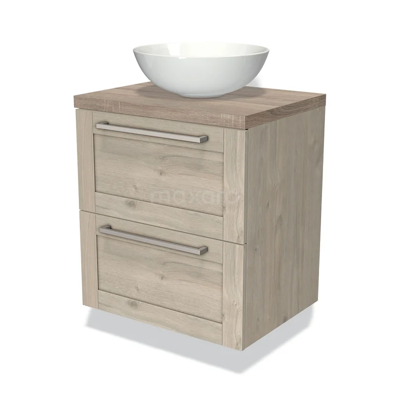 Badmöbel für Aufsatzwaschbecken 60cm Modulo Plato hellgraue Eiche 2 Schubladen Rahmen Eiche Platte