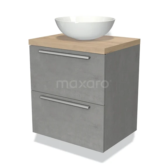 Badmöbel für Aufsatzwaschbecken 60cm Modulo Plato hellgrauer Beton 2 Schubladen Flach hellbraune Eiche Platte