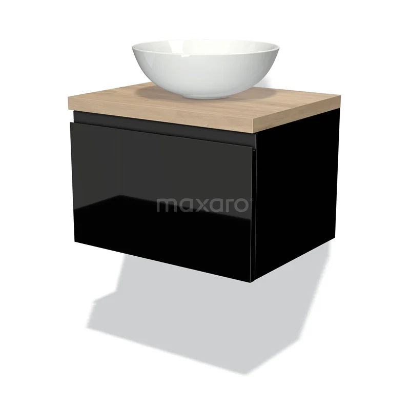 Badmöbel für Aufsatzwaschbecken 60cm Modulo Plato Hochglanz Schwarz 1 Schublade Grifflos Hellbraune Eiche Platte