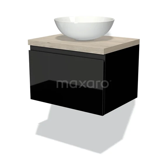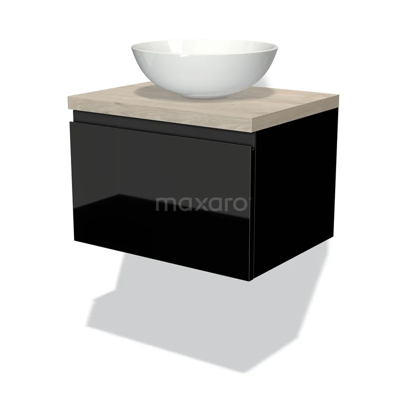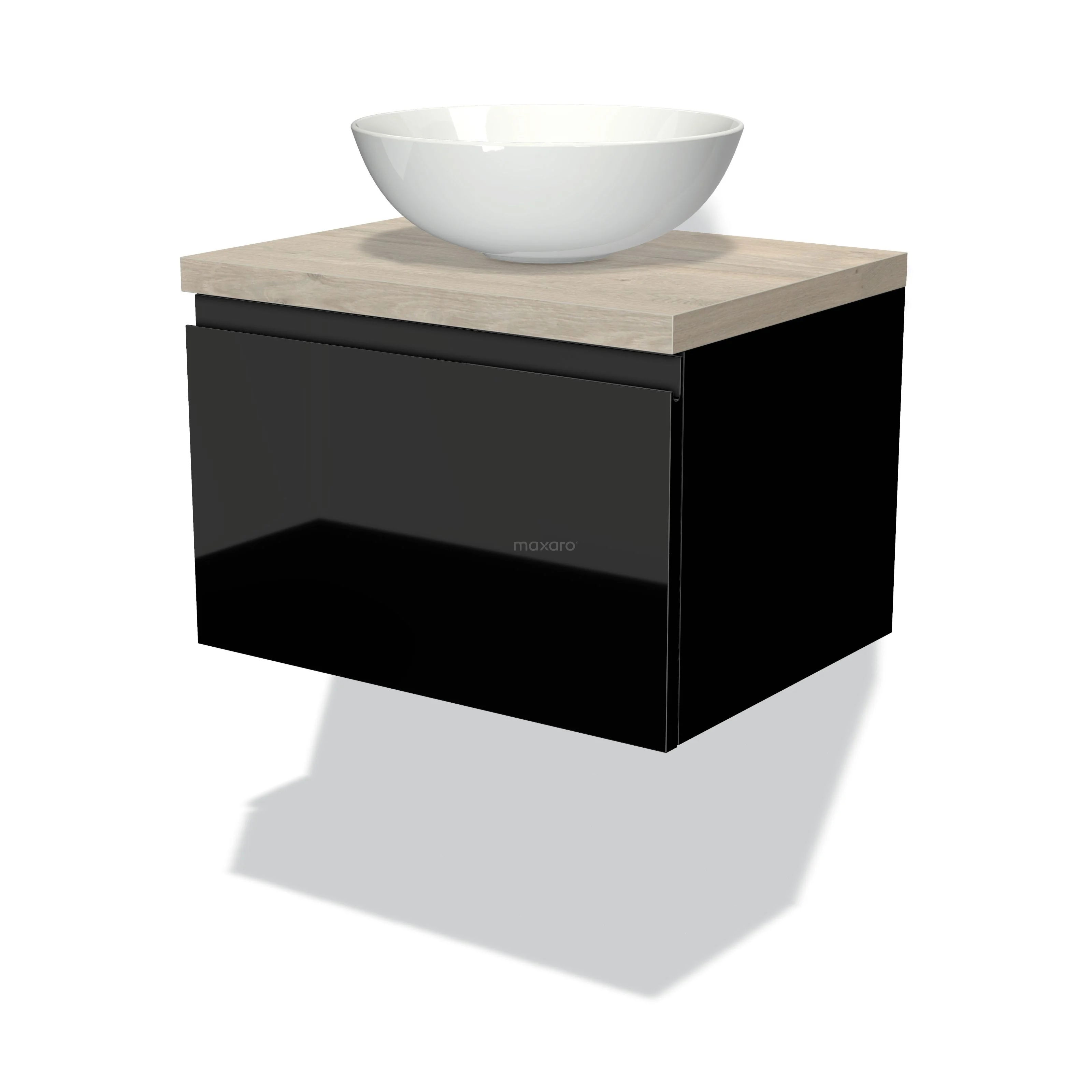 Badmöbel für Aufsatzwaschbecken 60cm Modulo Plato Hochglanz Schwarz 1 Schublade Grifflos Hellgraue Eiche Platte