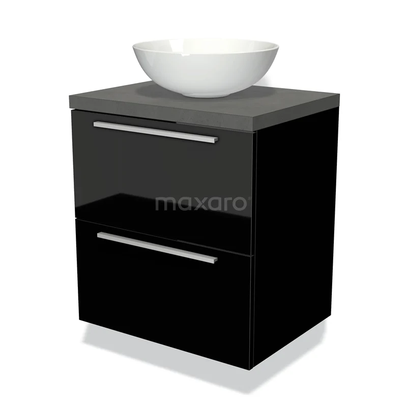 Badmöbel für Aufsatzwaschbecken 60cm Modulo Plato Hochglanz Schwarz 2 Schubladen Flach Dunkelgrau Beton Platte