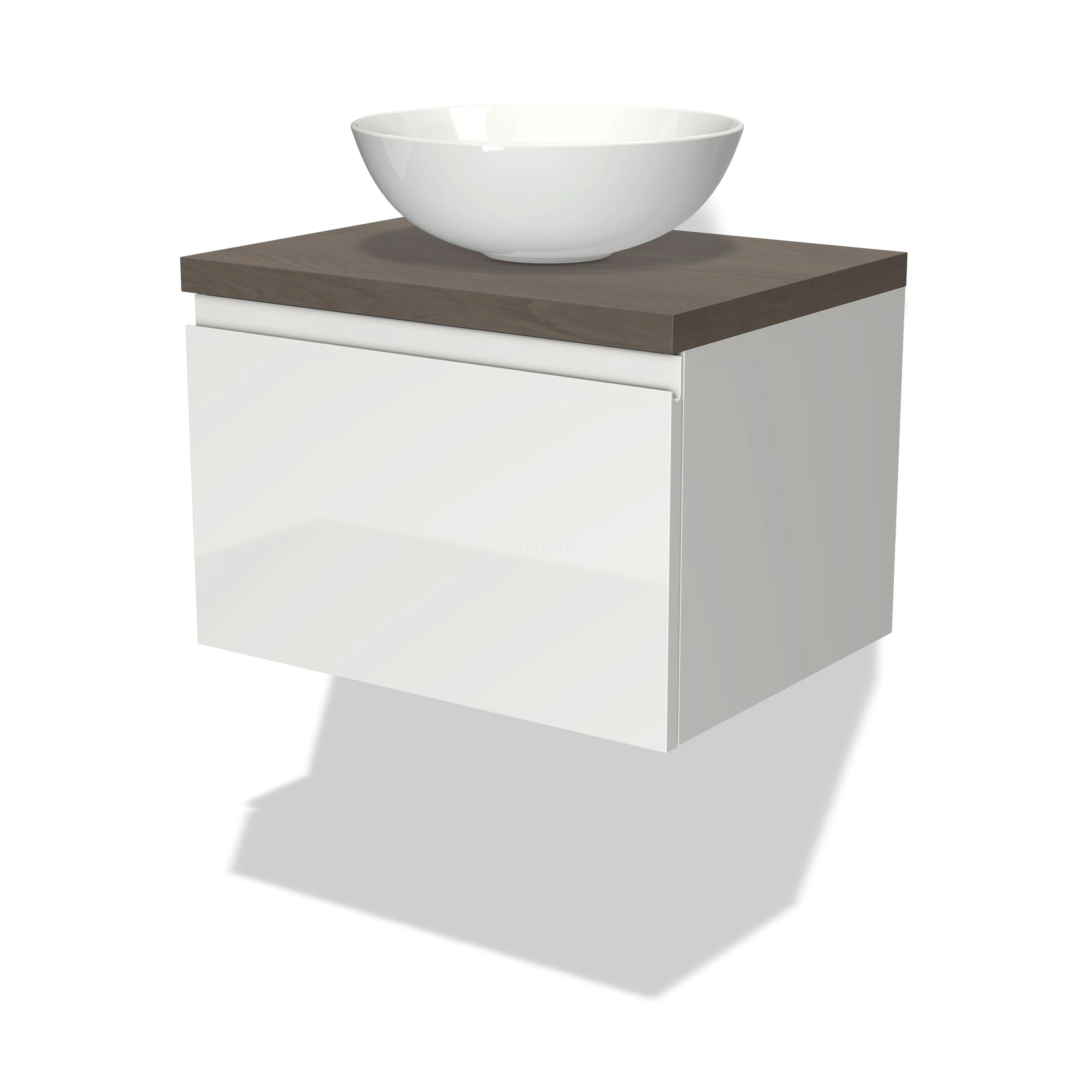 Badmöbel für Aufsatzwaschbecken 60cm Modulo Plato Hochglanz Weiß 1 Schublade grifflos dunkelbraune Eiche Platte