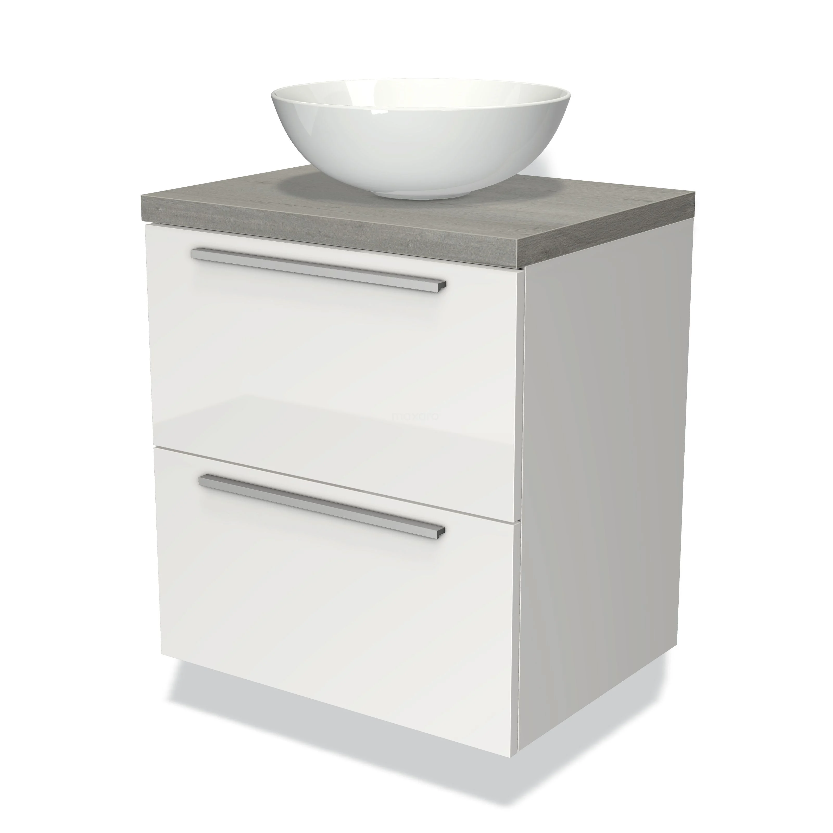 Badmöbel für Aufsatzwaschbecken 60cm Modulo Plato Hochglanz Weiß 2 Schubladen Flach Grau Eiche Platte