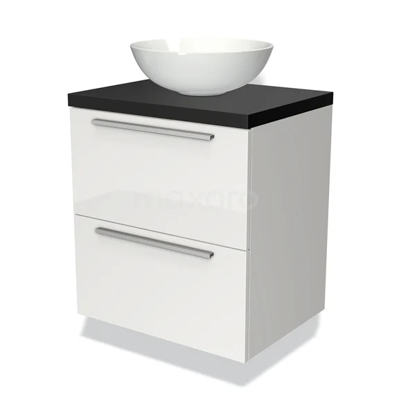 Badmöbel für Aufsatzwaschbecken 60cm Modulo Plato Hochglanz Weiß 2 Schubladen Flach Matt Schwarz Platte