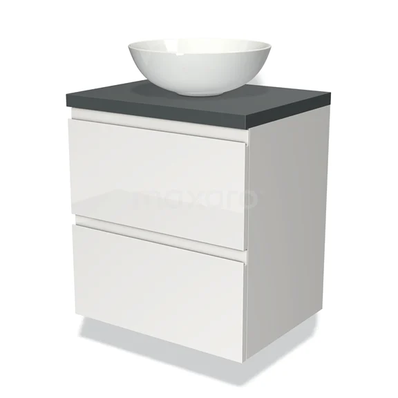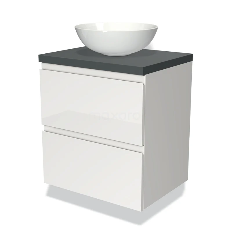 Badmöbel für Aufsatzwaschbecken 60cm Modulo Plato Hochglanz Weiß 2 Schubladen Grifflos Dunkelgrau Platte