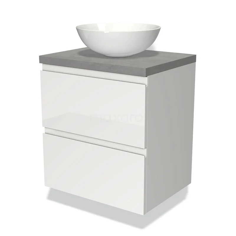 Badmöbel für Aufsatzwaschbecken 60cm Modulo Plato Hochglanz Weiß 2 Schubladen Grifflos Hellgrauer Beton Platte