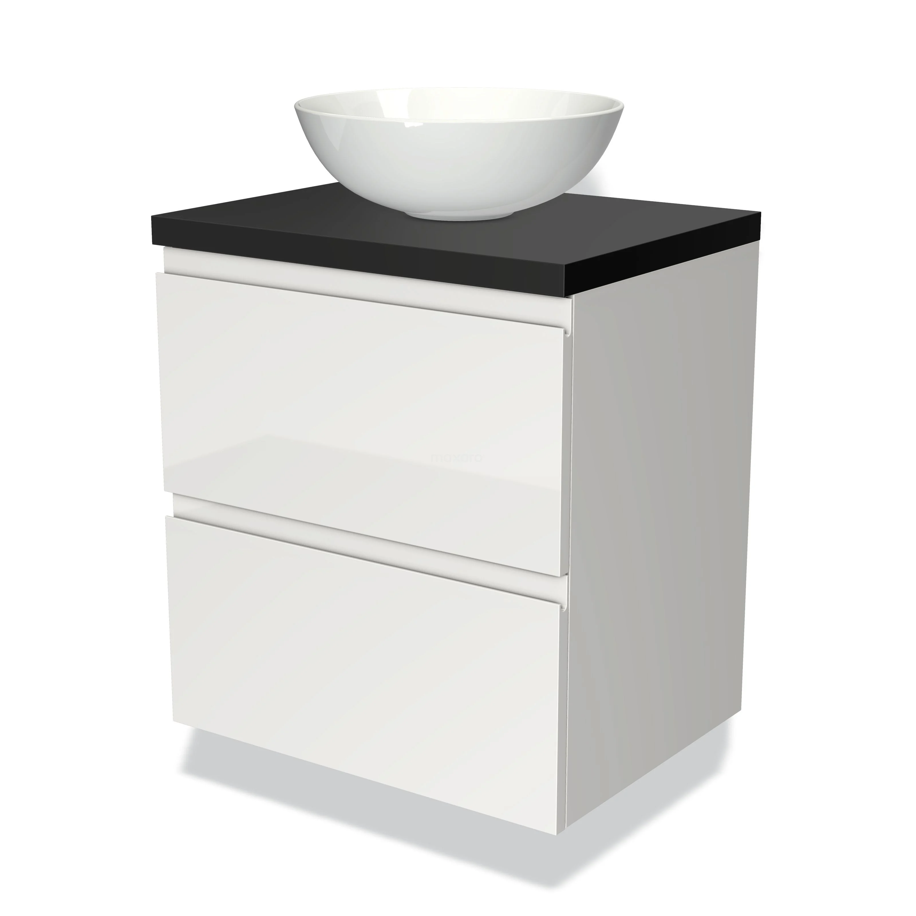 Badmöbel für Aufsatzwaschbecken 60cm Modulo Plato Hochglanz Weiß 2 Schubladen Grifflos Matt Schwarz Platte