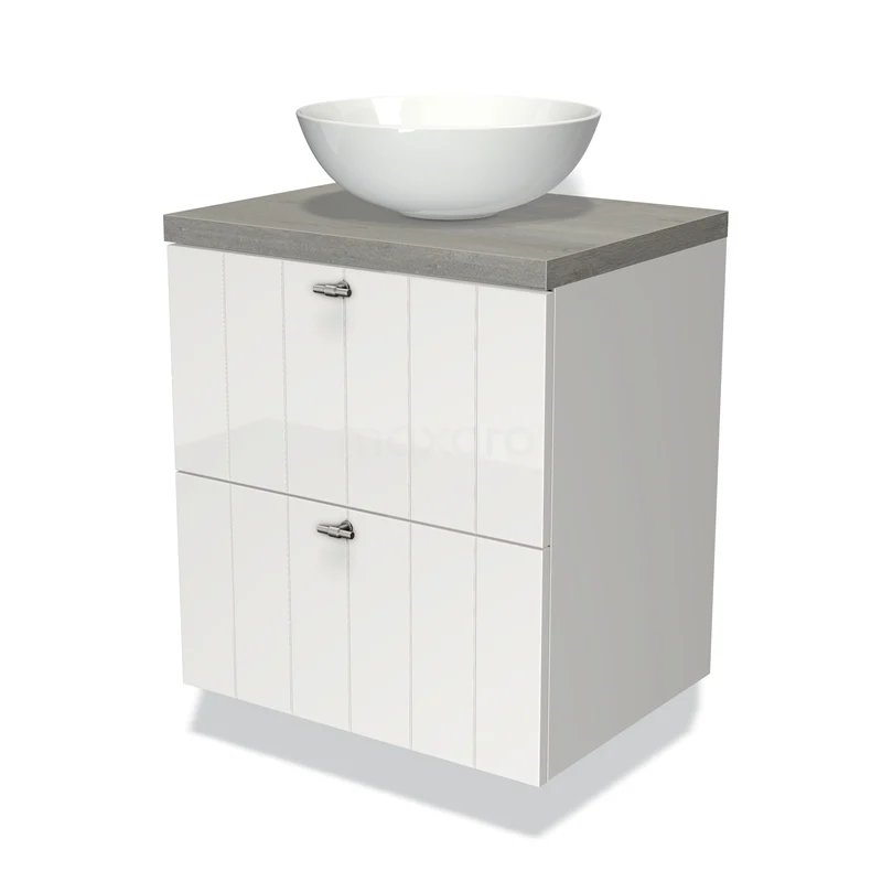 Badmöbel für Aufsatzwaschbecken 60cm Modulo Plato Hochglanz Weiß 2 Schubladen Lamelle Graue Eiche Platte