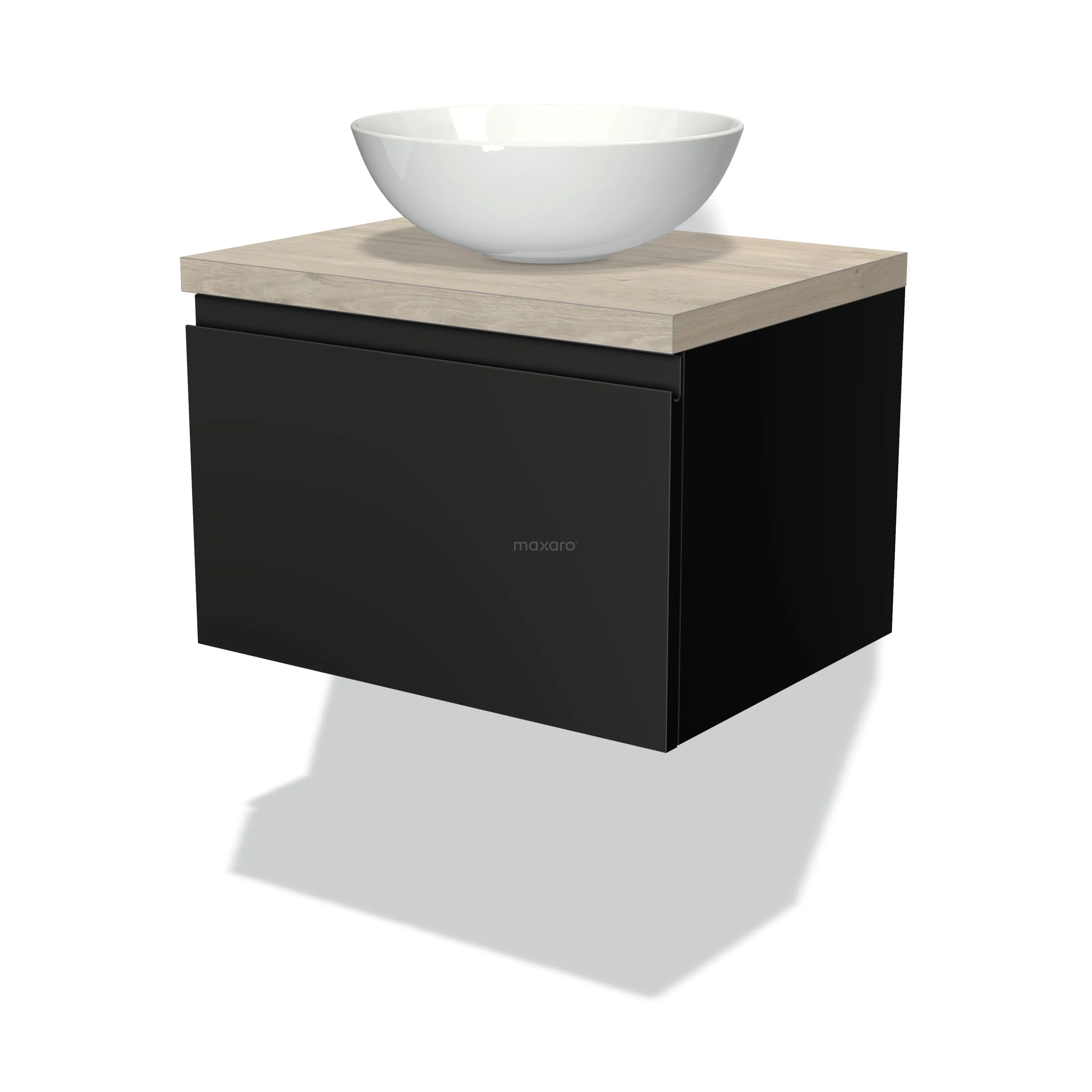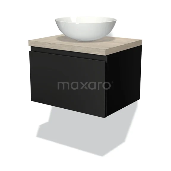 Badmöbel für Aufsatzwaschbecken 60cm Modulo Plato Matt Schwarz 1 Schublade Grifflos Hellgraue Eiche Platte