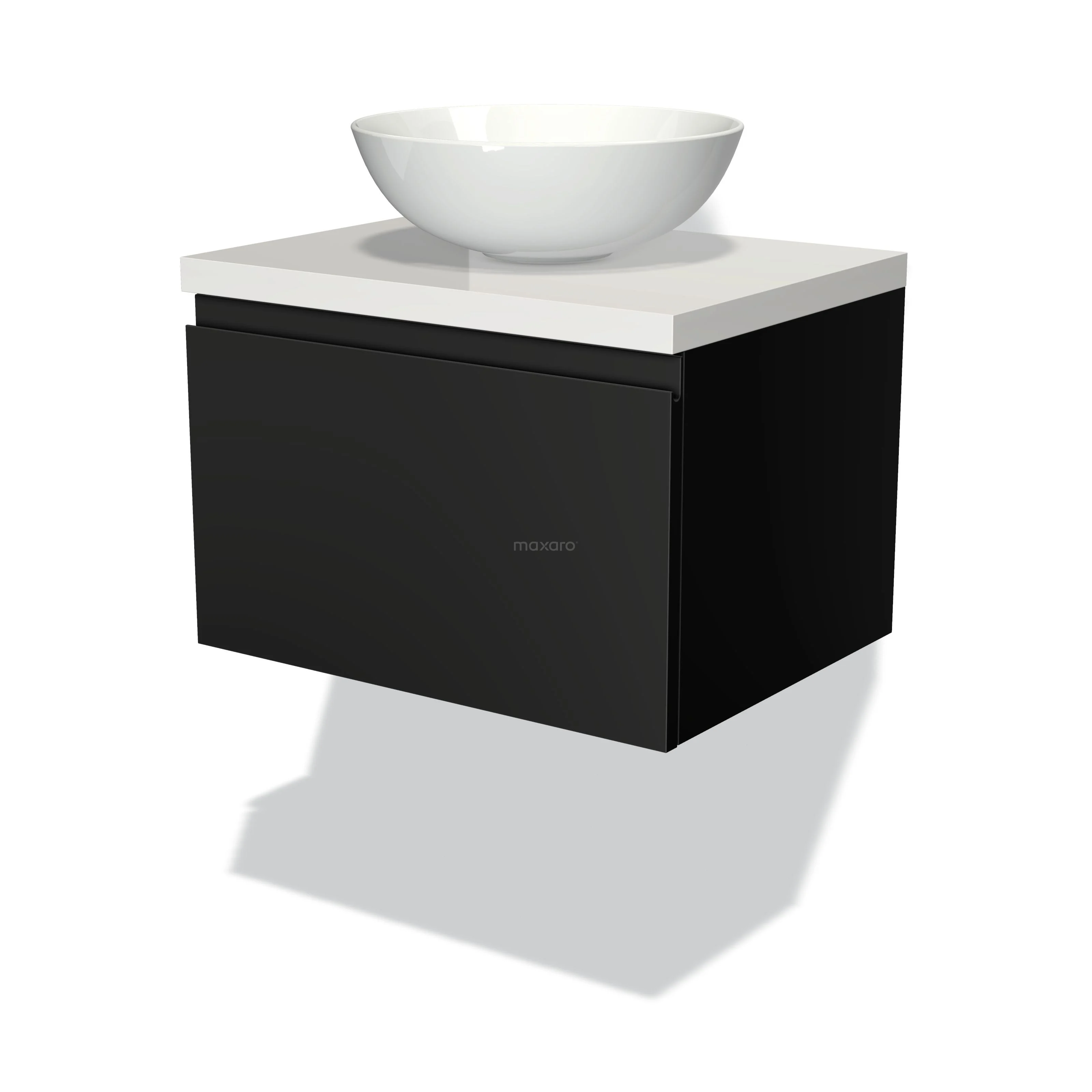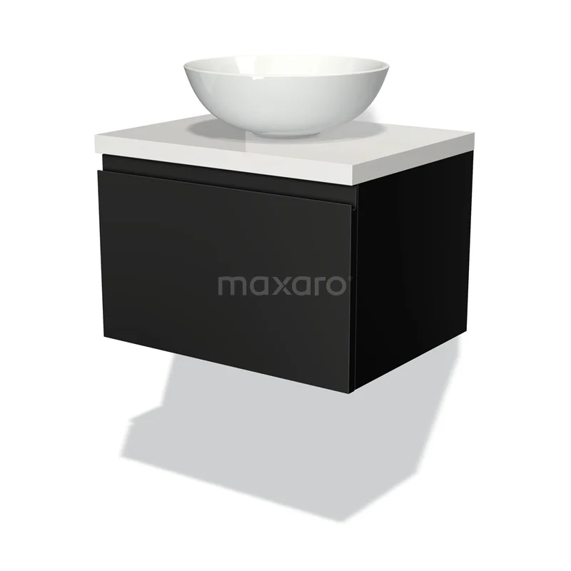 Badmöbel für Aufsatzwaschbecken 60cm Modulo Plato Matt Schwarz 1 Schublade Grifflos Hochglanz Weiß Platte