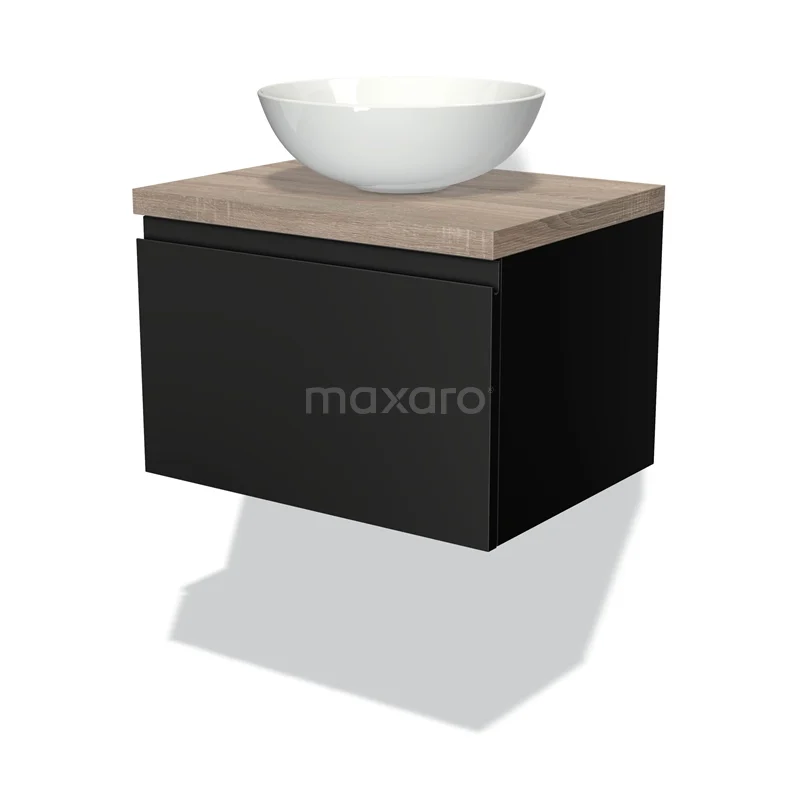 Badmöbel für Aufsatzwaschbecken 60cm Modulo Plato Matt Schwarz 1 Schublade Grifflose Platte Eiche