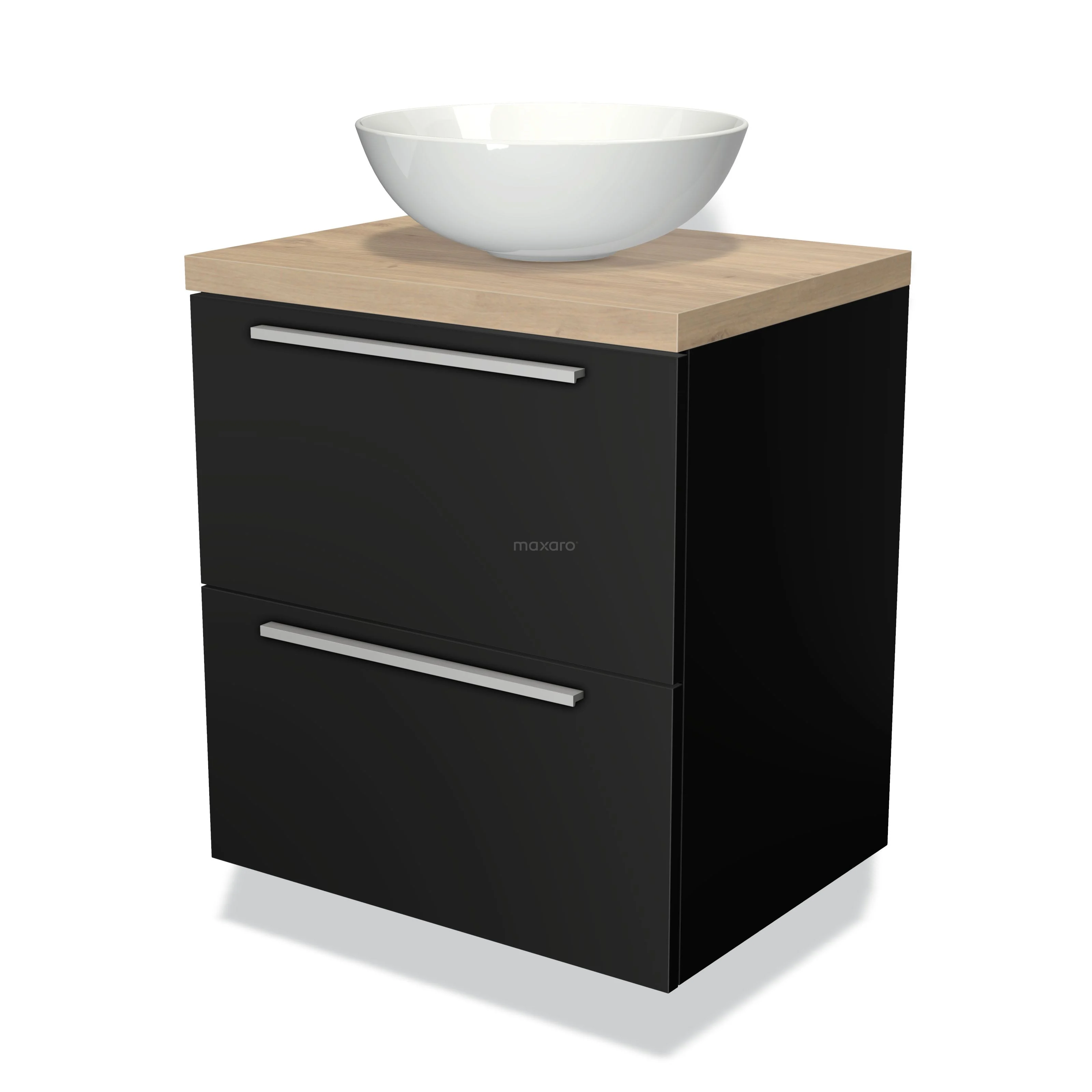 Badmöbel für Aufsatzwaschbecken 60cm Modulo Plato Matt Schwarz 2 Schubladen Flach Hellbraune Eiche Platte