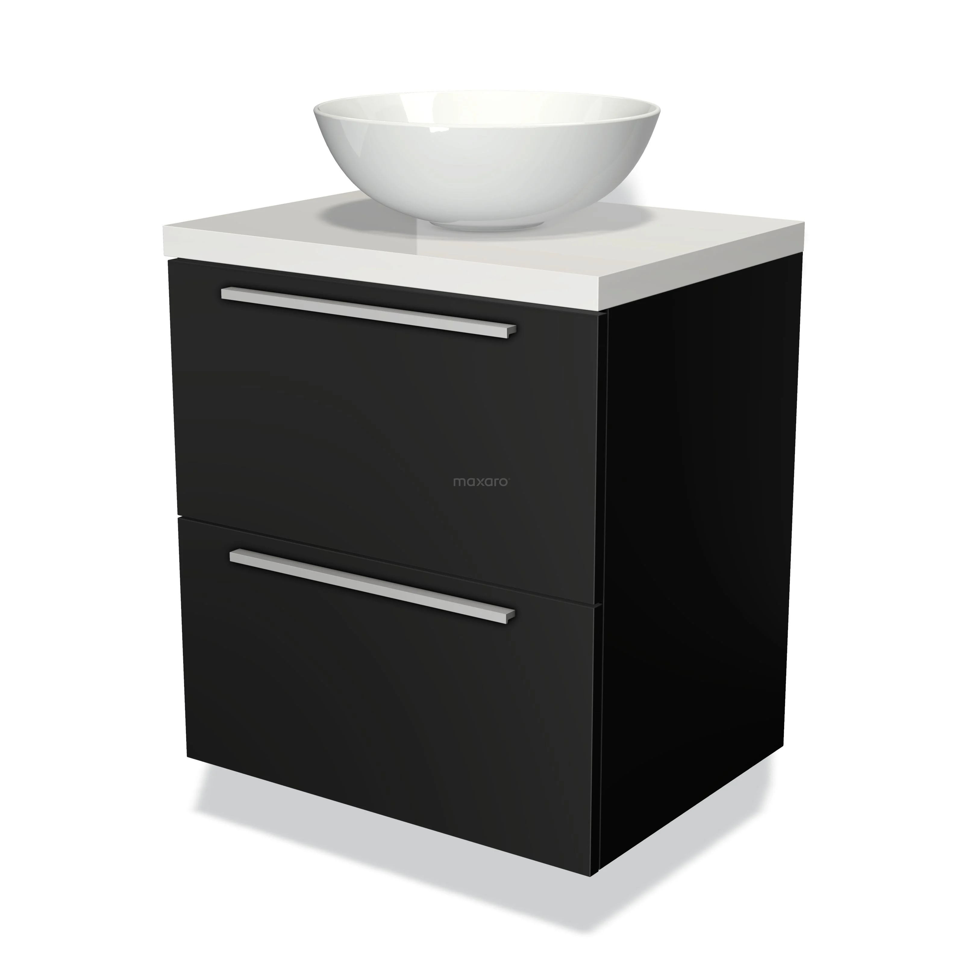 Badmöbel für Aufsatzwaschbecken 60cm Modulo Plato Matt Schwarz 2 Schubladen Flach Hochglanz Weiß Platte