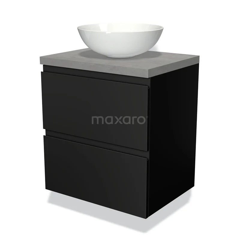 Badmöbel für Aufsatzwaschbecken 60cm Modulo Plato Matt Schwarz 2 Schubladen Grifflos hellgrauer Beton Platte