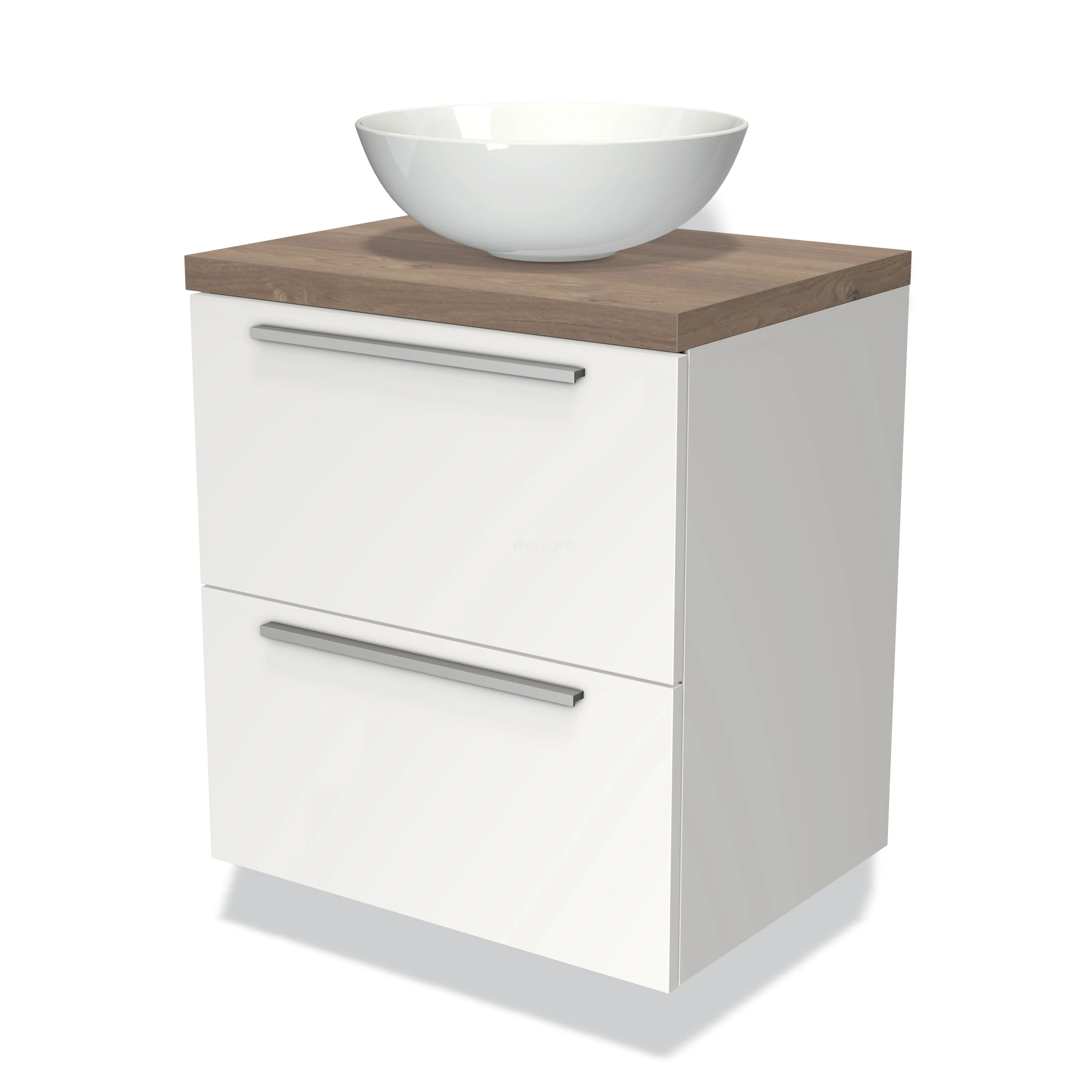 Badmöbel für Aufsatzwaschbecken 60cm Modulo Plato Matt Weiß 2 Schubladen Flach Mittelbraune Eiche Platte