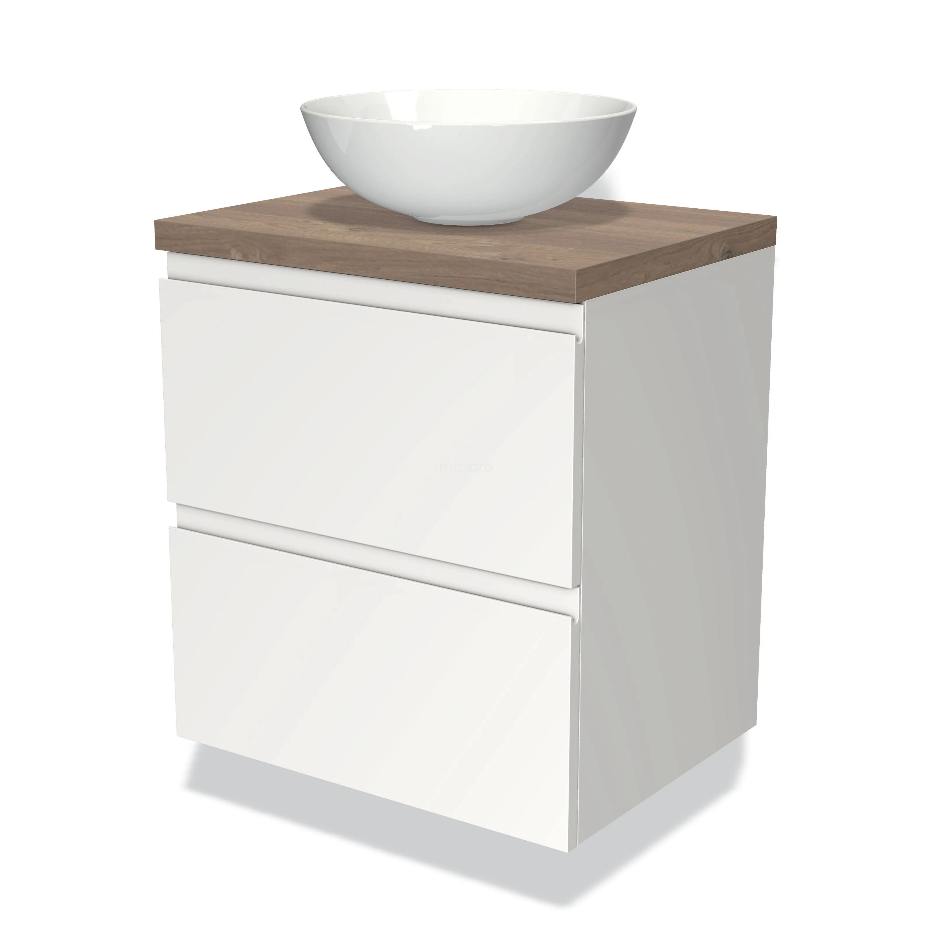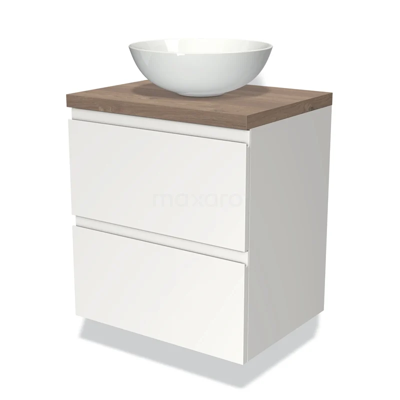Badmöbel für Aufsatzwaschbecken 60cm Modulo Plato Matt Weiß 2 Schubladen Grifflos mittelbraune Eiche Platte